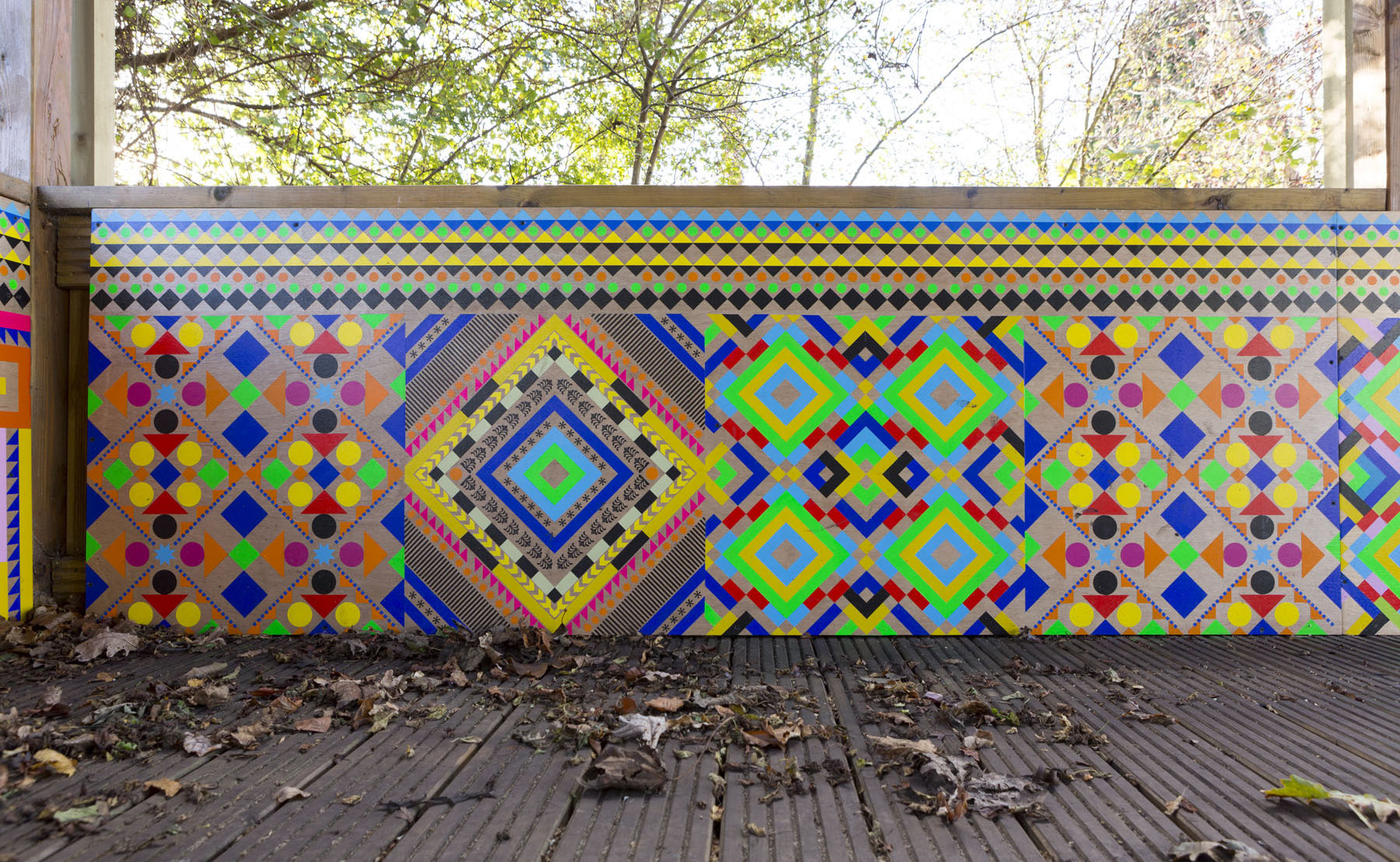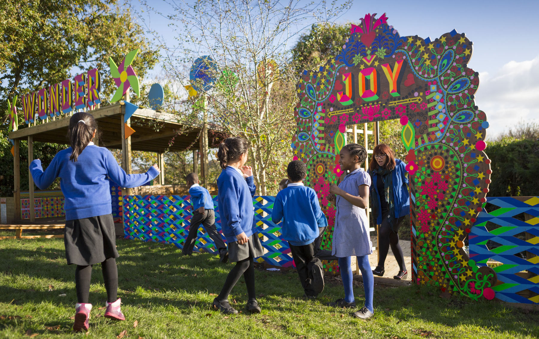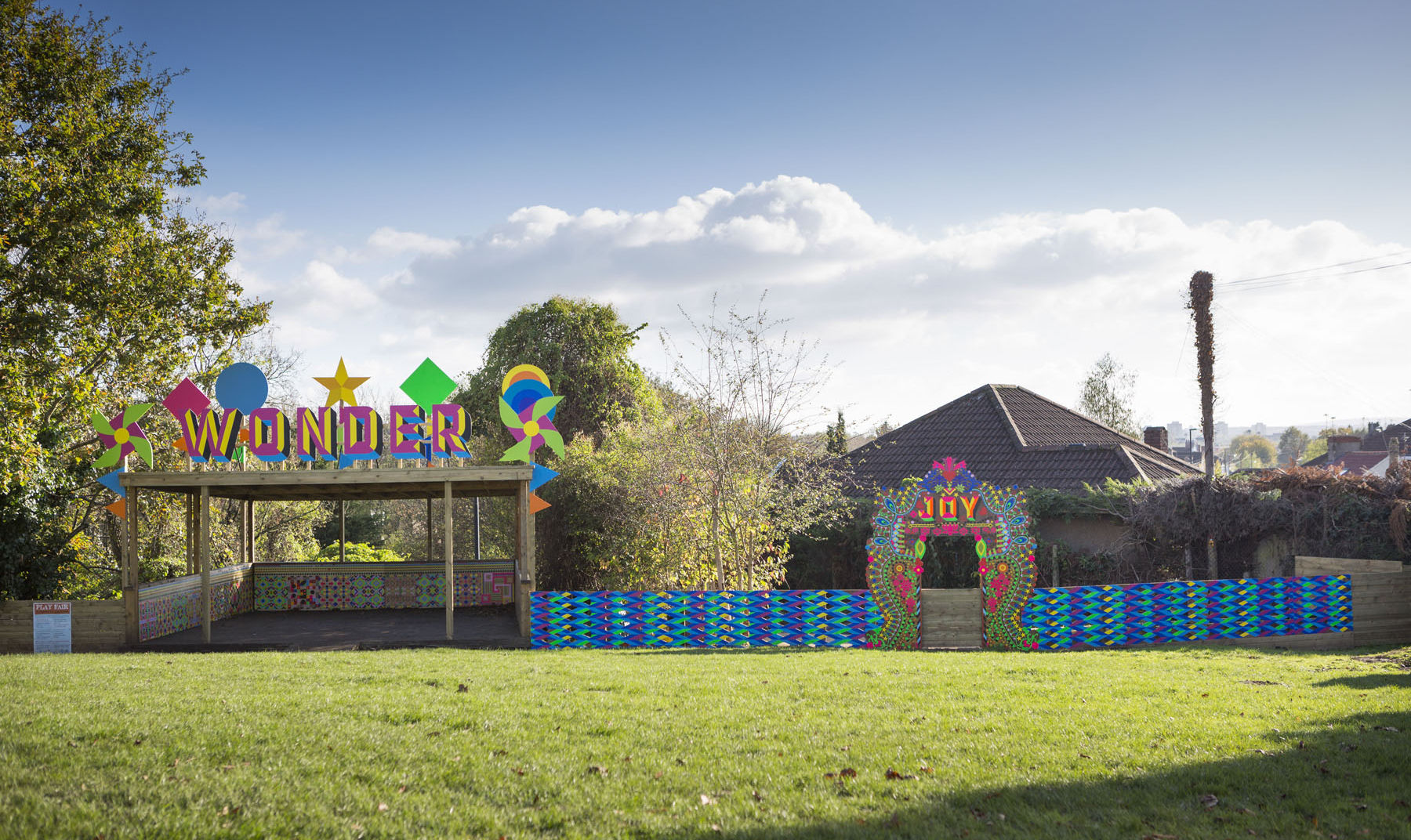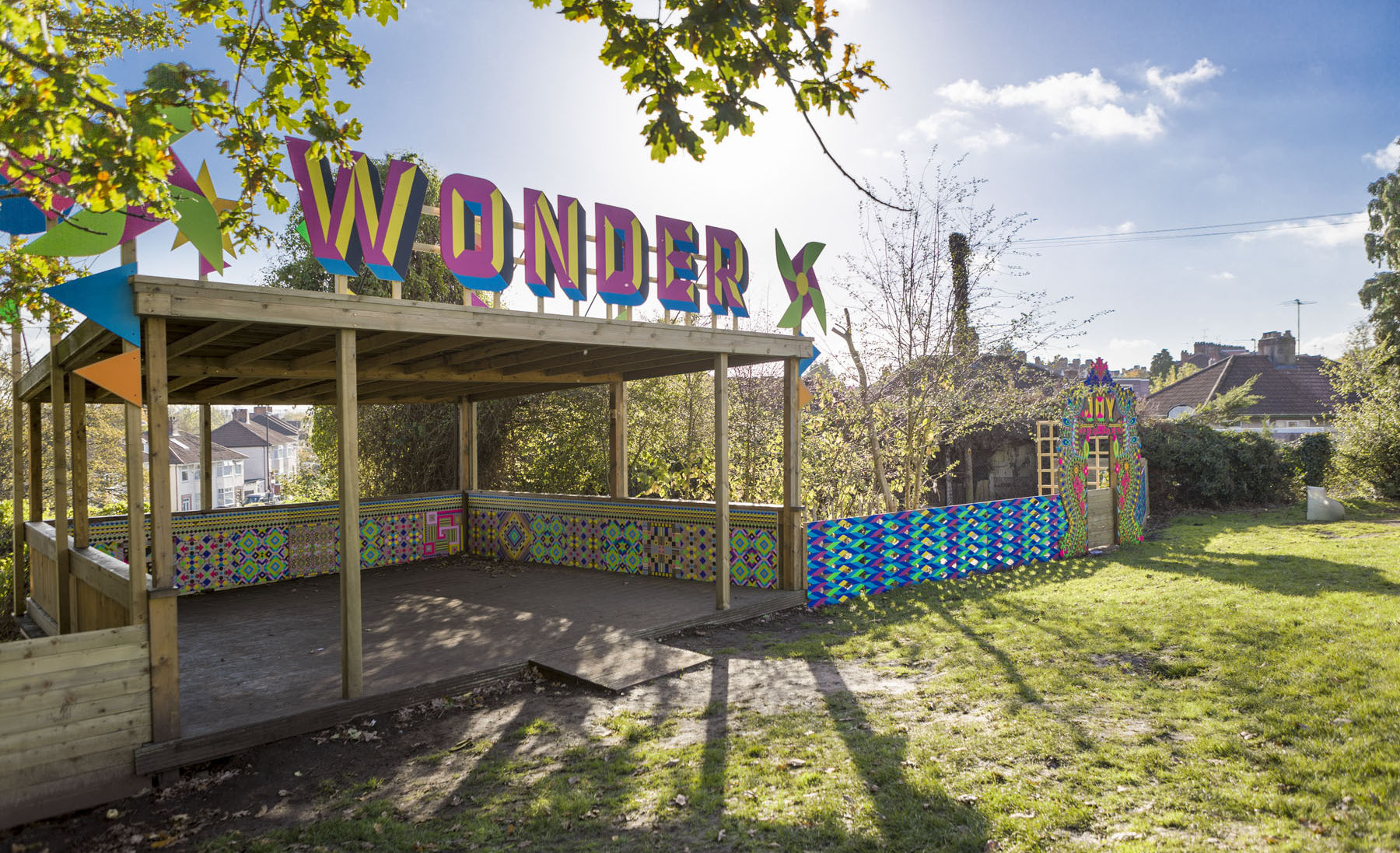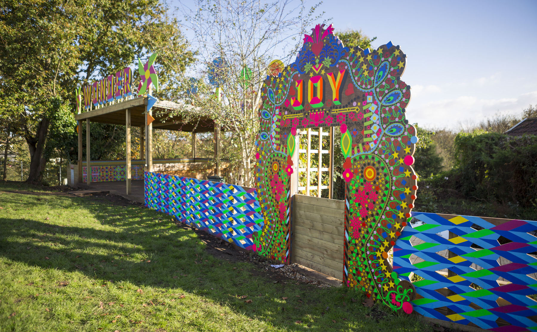 Myerscough's work for Glenfrome is entitled the Wonder Pavilion, and comprises of a treatment to an existing structure in the gardens of the school. Myerscough chose to work with an existing timber structure that provides cover for the children in response to comments from the school and Head Teacher, who felt the structure could be improved visually and physically.