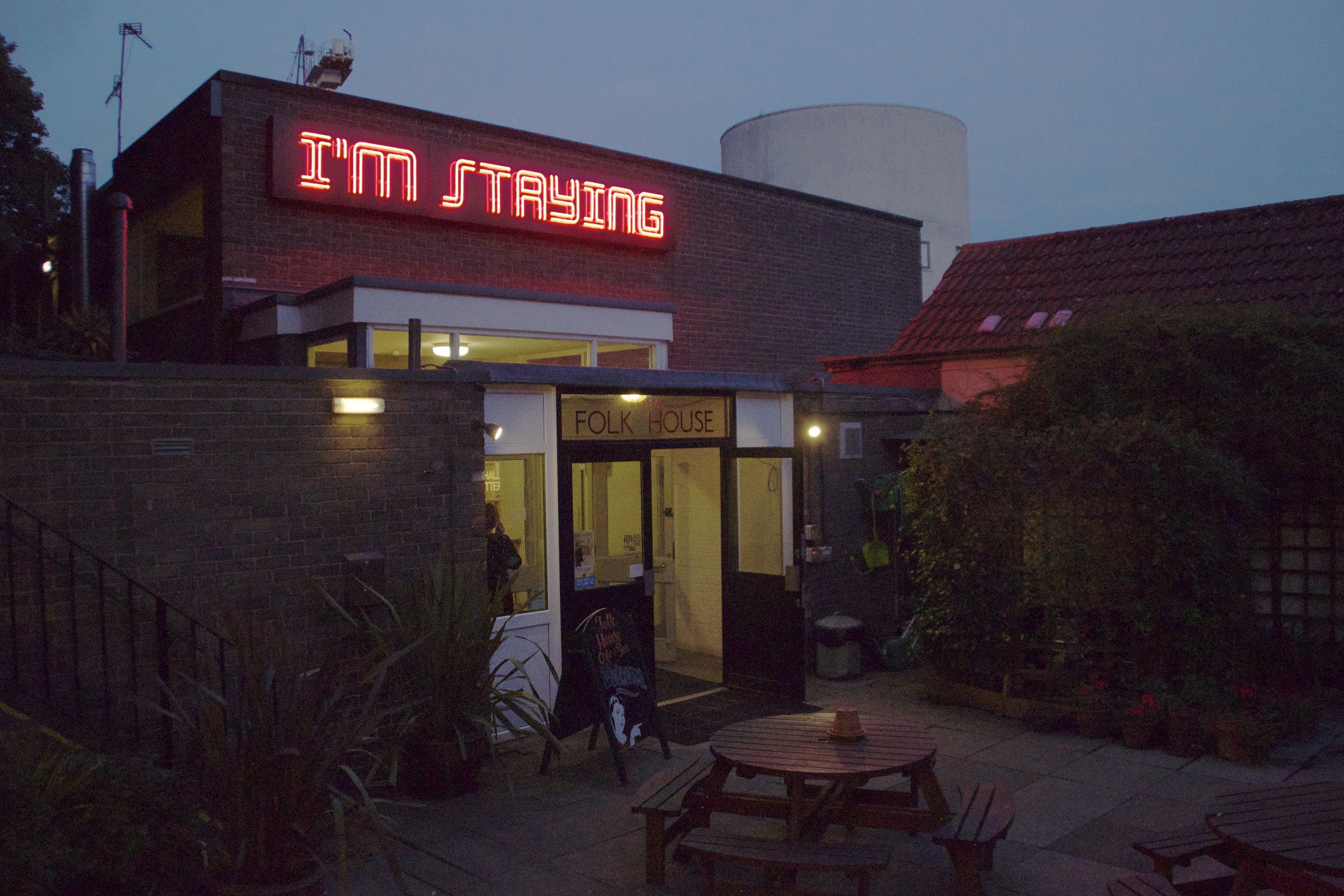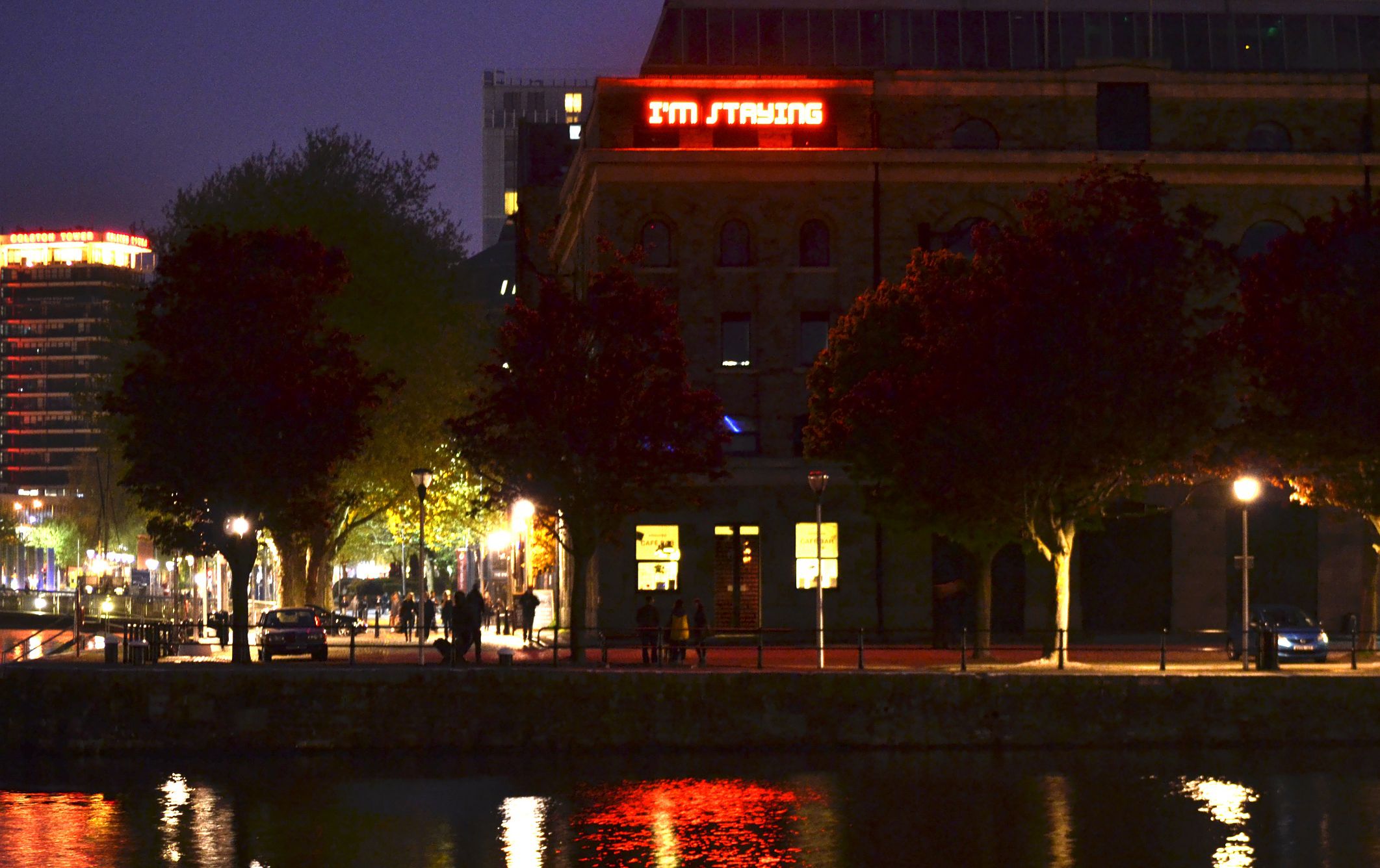 I'M STAYING is a new public artwork by Shaun C Badham, addressing ideas of place and change, permanence and transition. It will move around Bristol over a two year period. Initially displayed on the outside of the Arnolfini building, after which viewers are invited to vote online and choose the next site for the neon artwork to be installed. You decide where the work will travel next: your street, your work, your home?