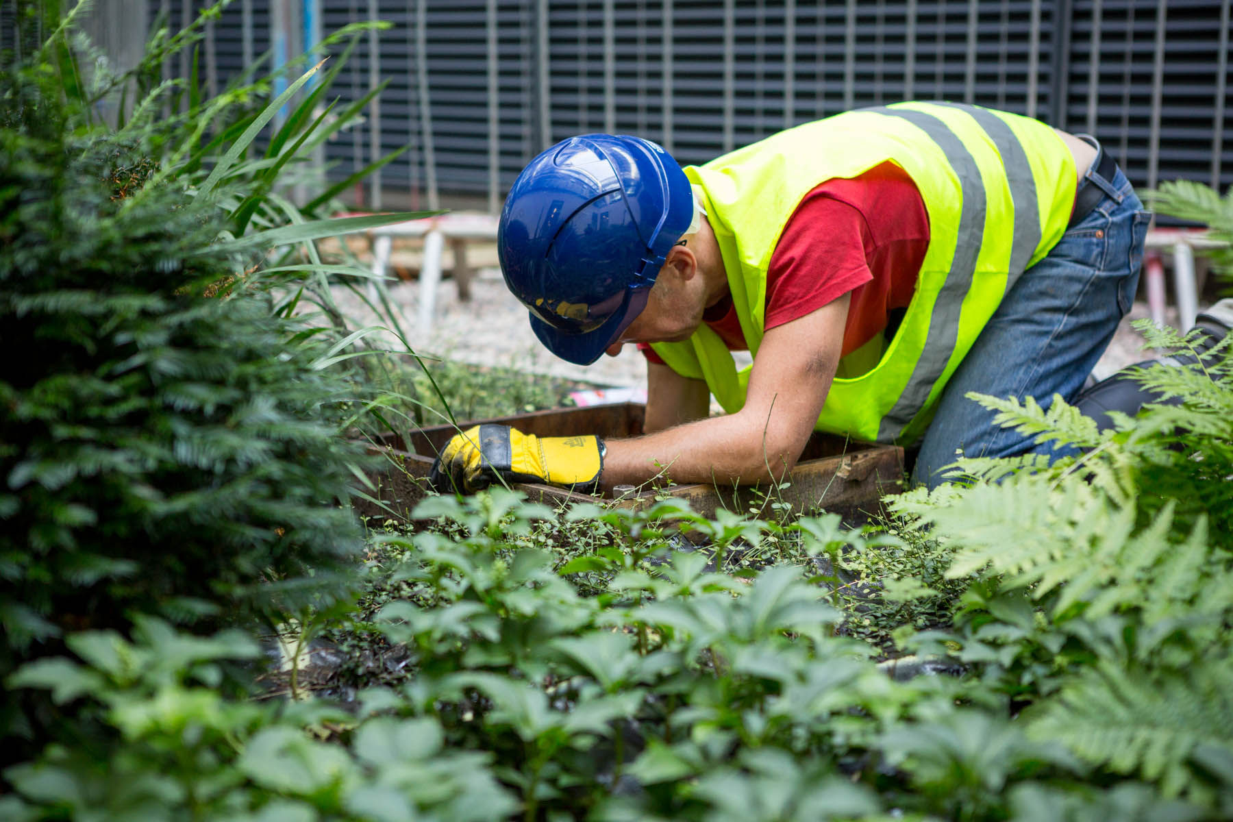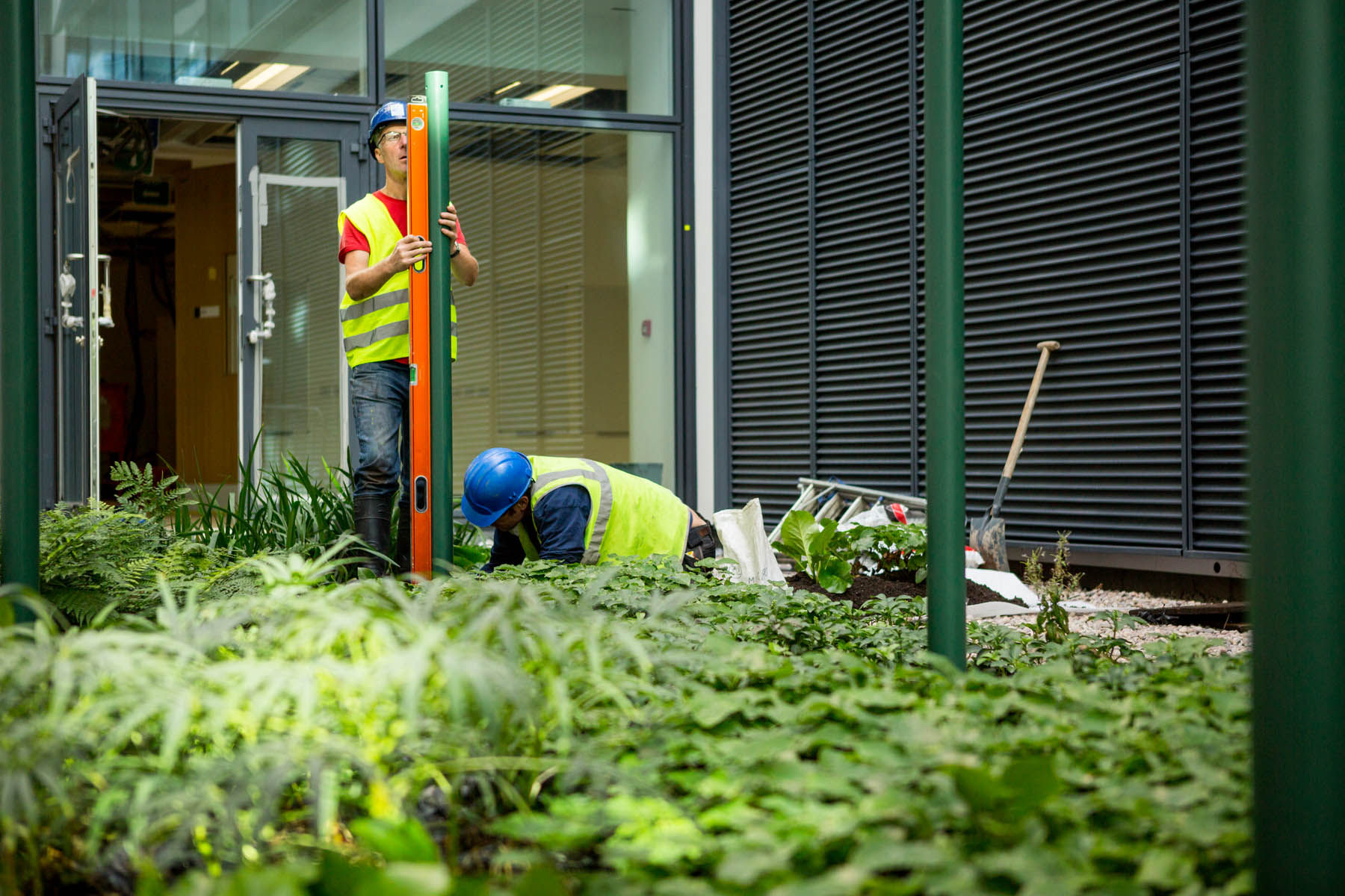 The discs’ coloured surfaces are illuminated by ambient natural light and appear to change according to the viewer’s position and the nature of the light itself. Wallace’s work cleverly makes use of the viewers’ position above the sculpture and the green planting below it, transforming the space into a large spatial colour field work where the discs appear to hover above the green foliage below.