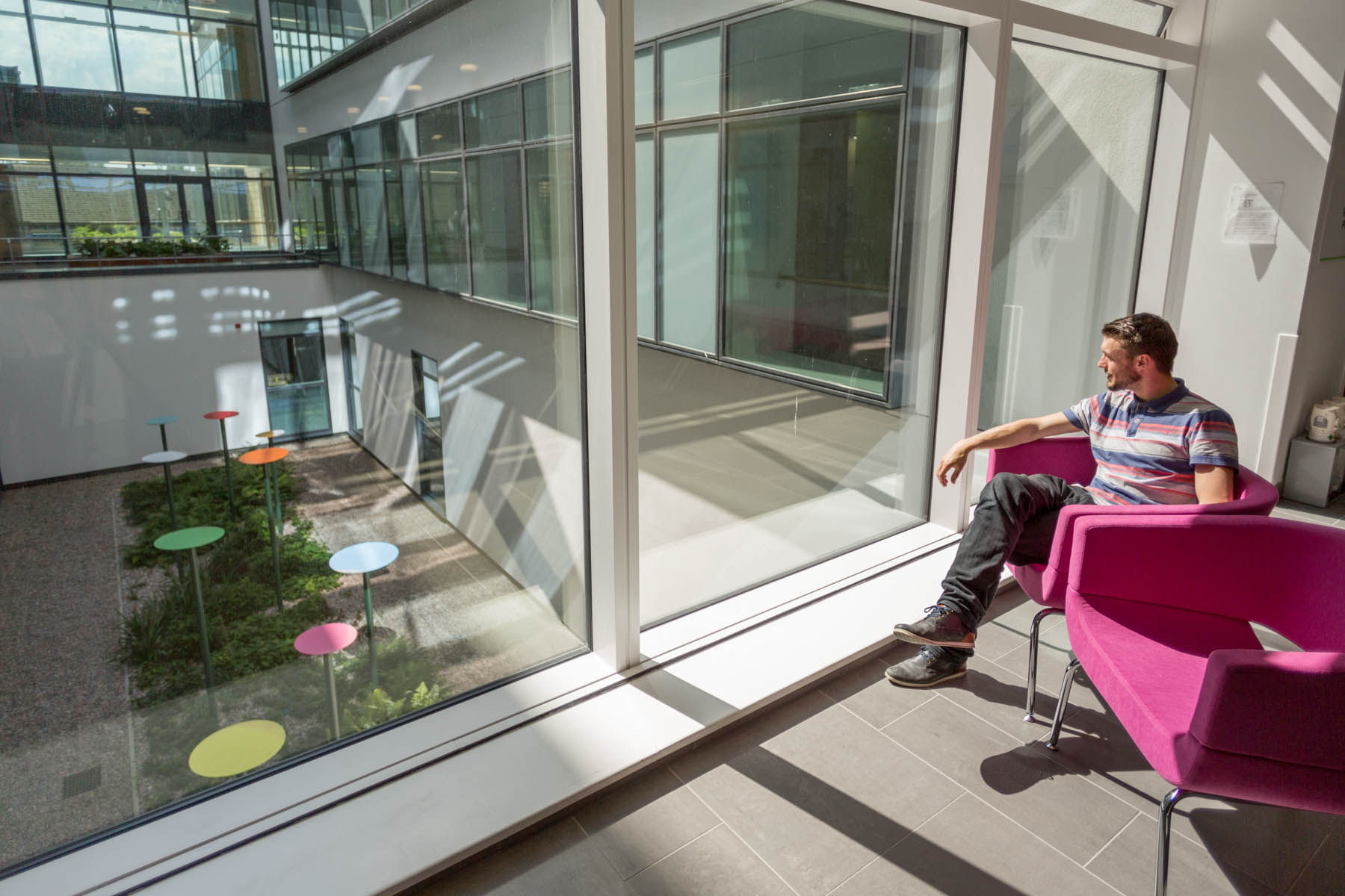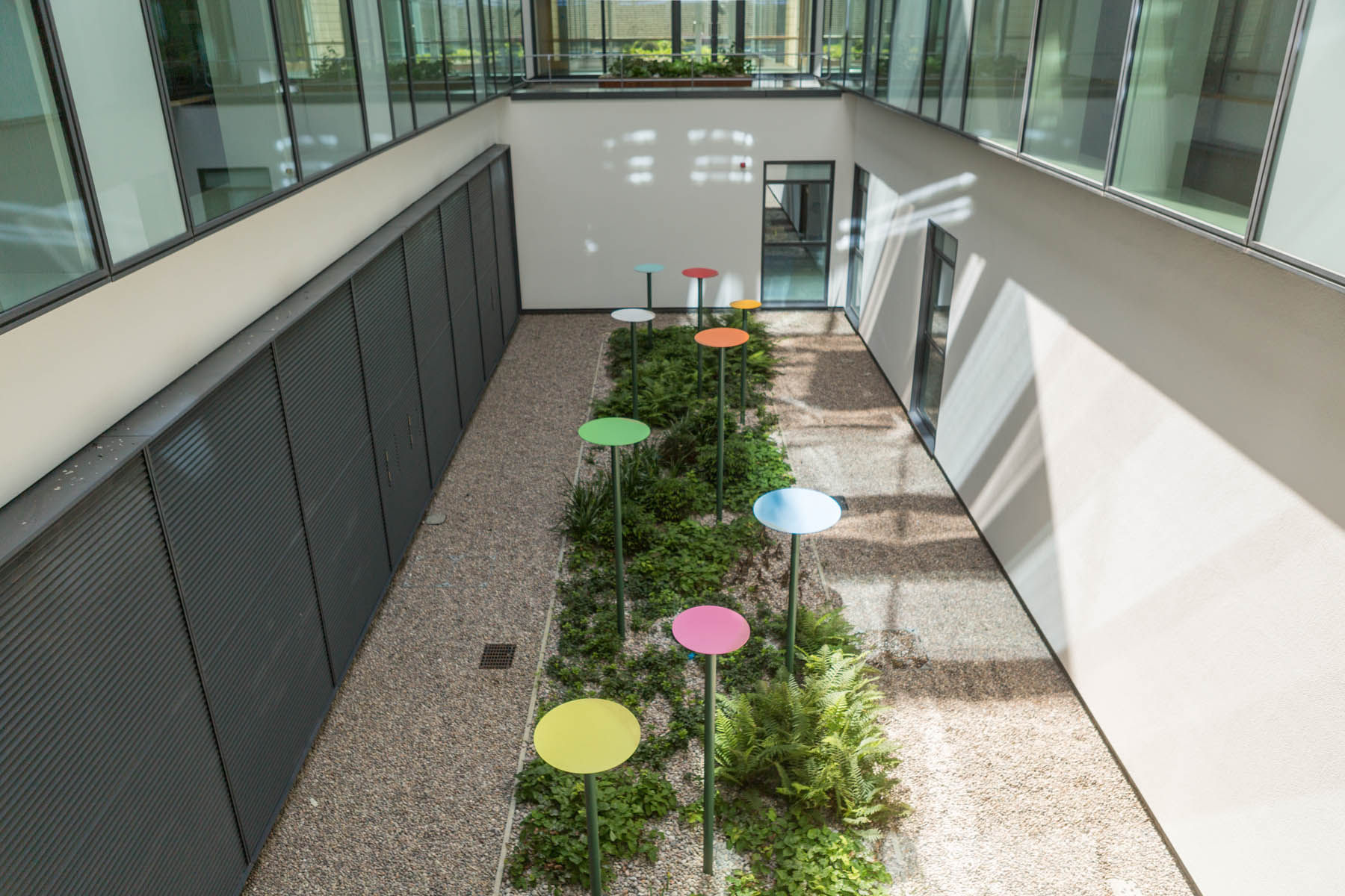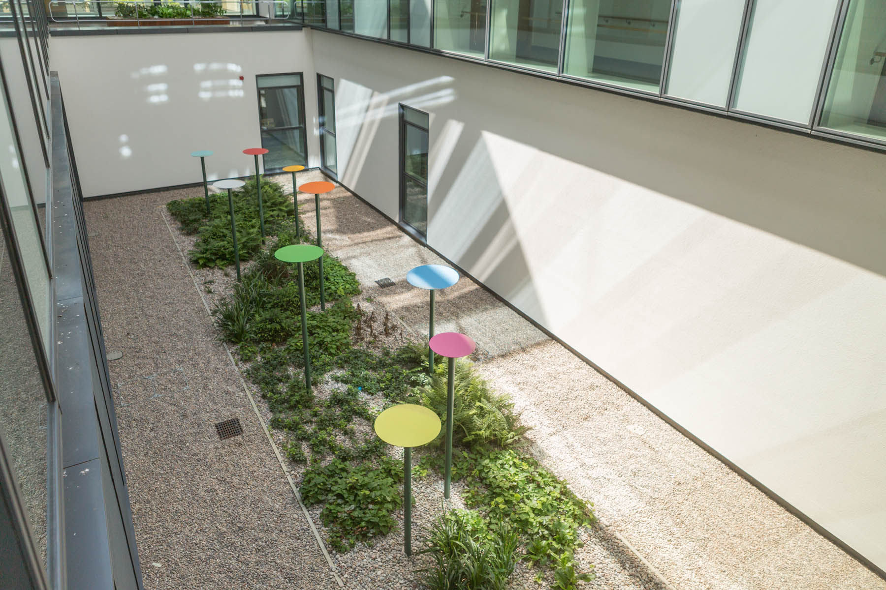 British artist Ally Wallace was commissioned to develop a new work for the Welled Courtyard within the new Southmead Hospital Bristol as part of the public art programme managed by Willis Newson. His work, ‘Coloured Discs’ is a bold and simple sculpture that introduces composition and colour into the planted landscape of a deep welled courtyard.