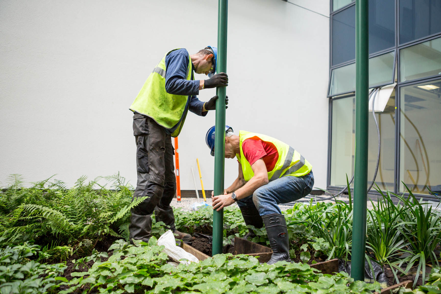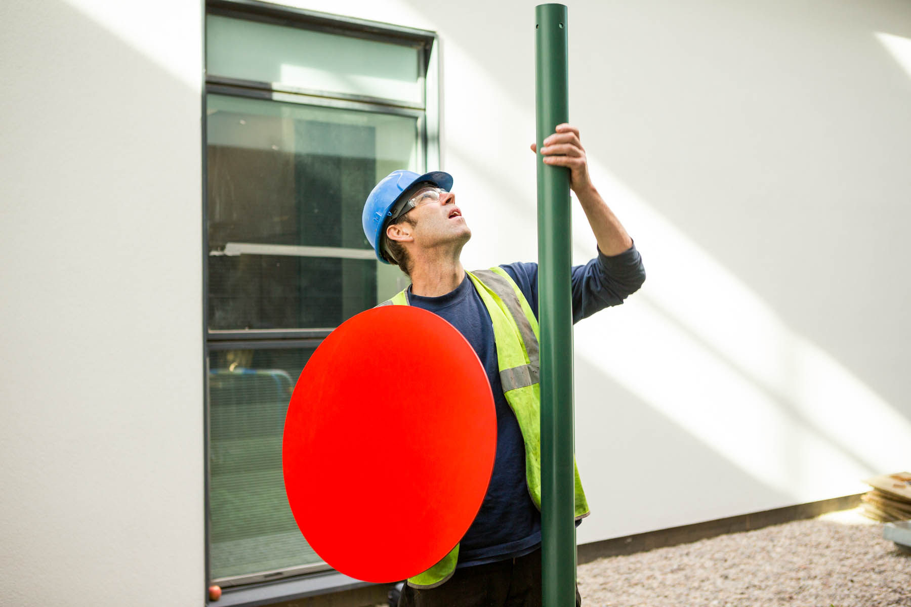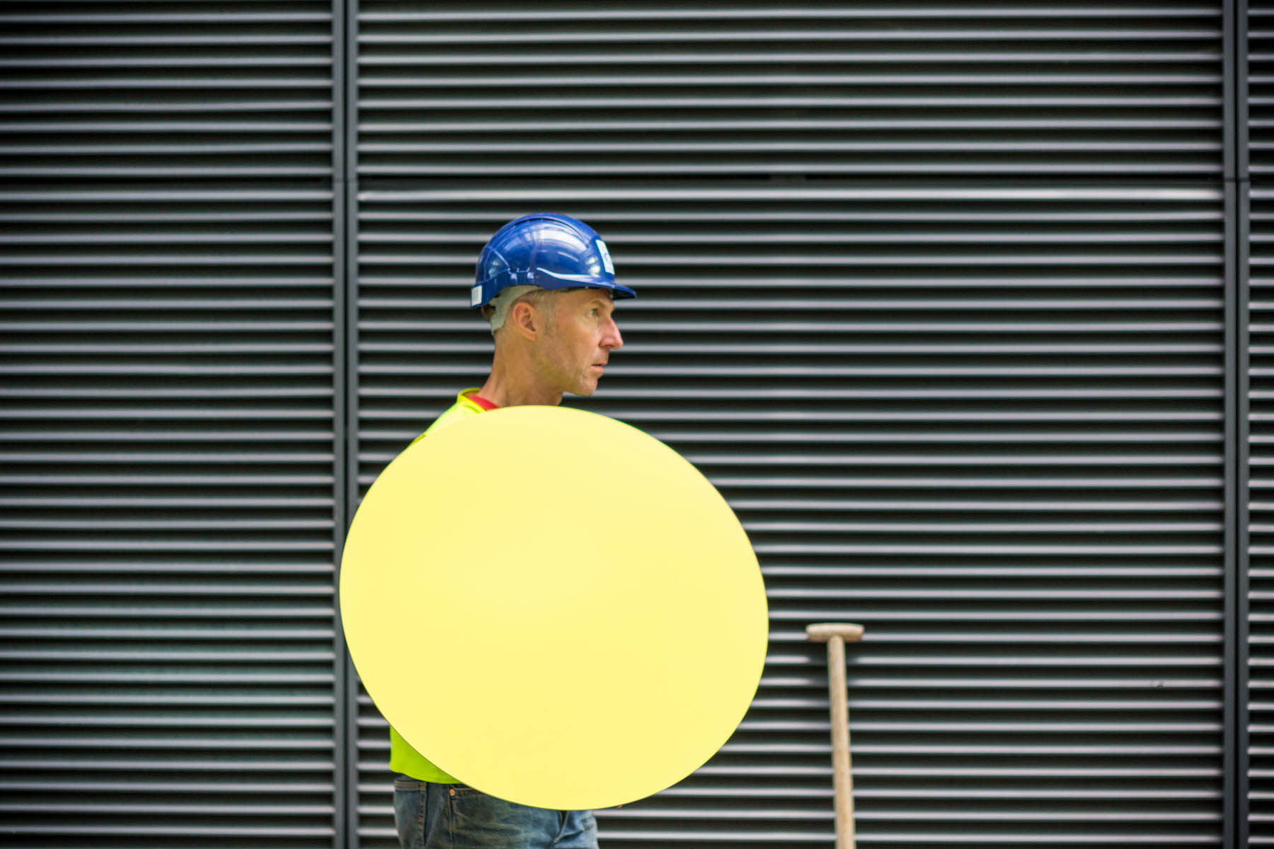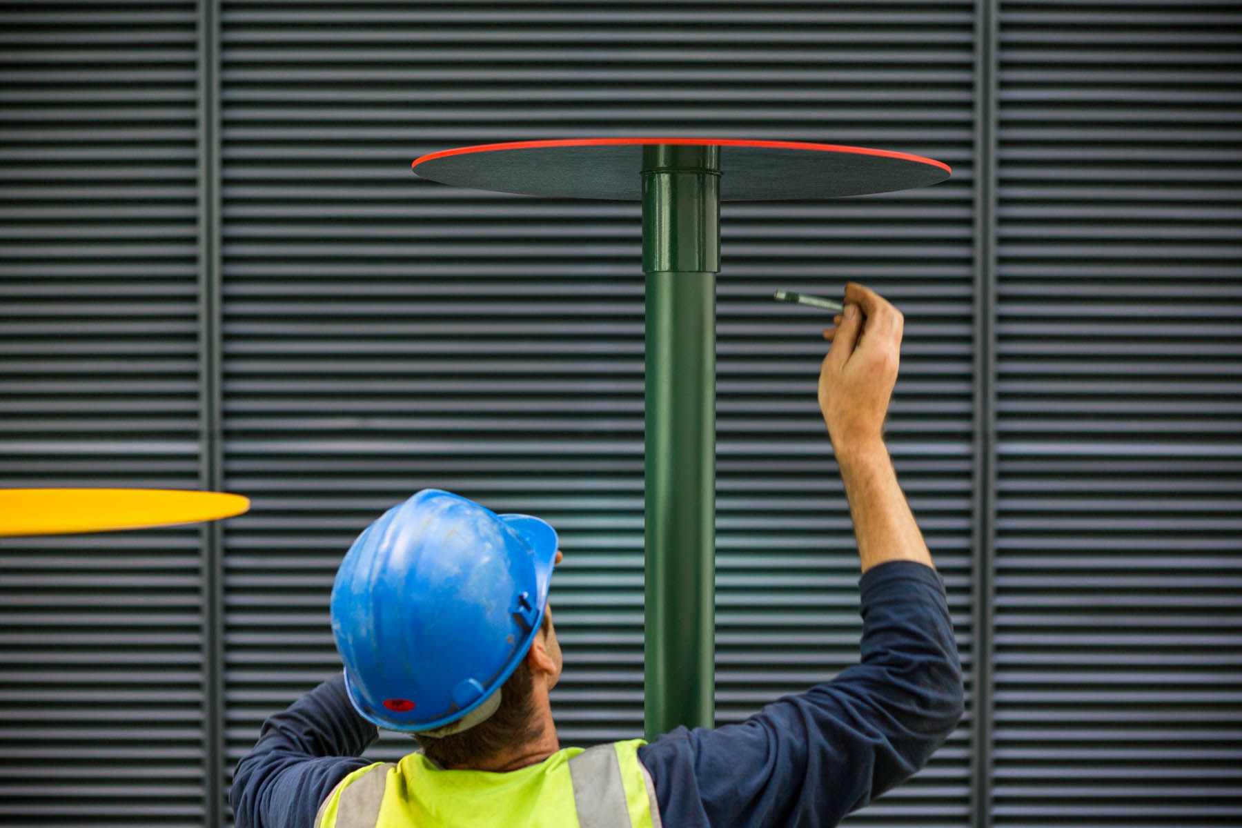 British artist Ally Wallace was commissioned to develop a new work for the Welled Courtyard within the new Southmead Hospital Bristol as part of the public art programme managed by Willis Newson. His work, ‘Coloured Discs’ is a bold and simple sculpture that introduces composition and colour into the planted landscape of a deep welled courtyard.
