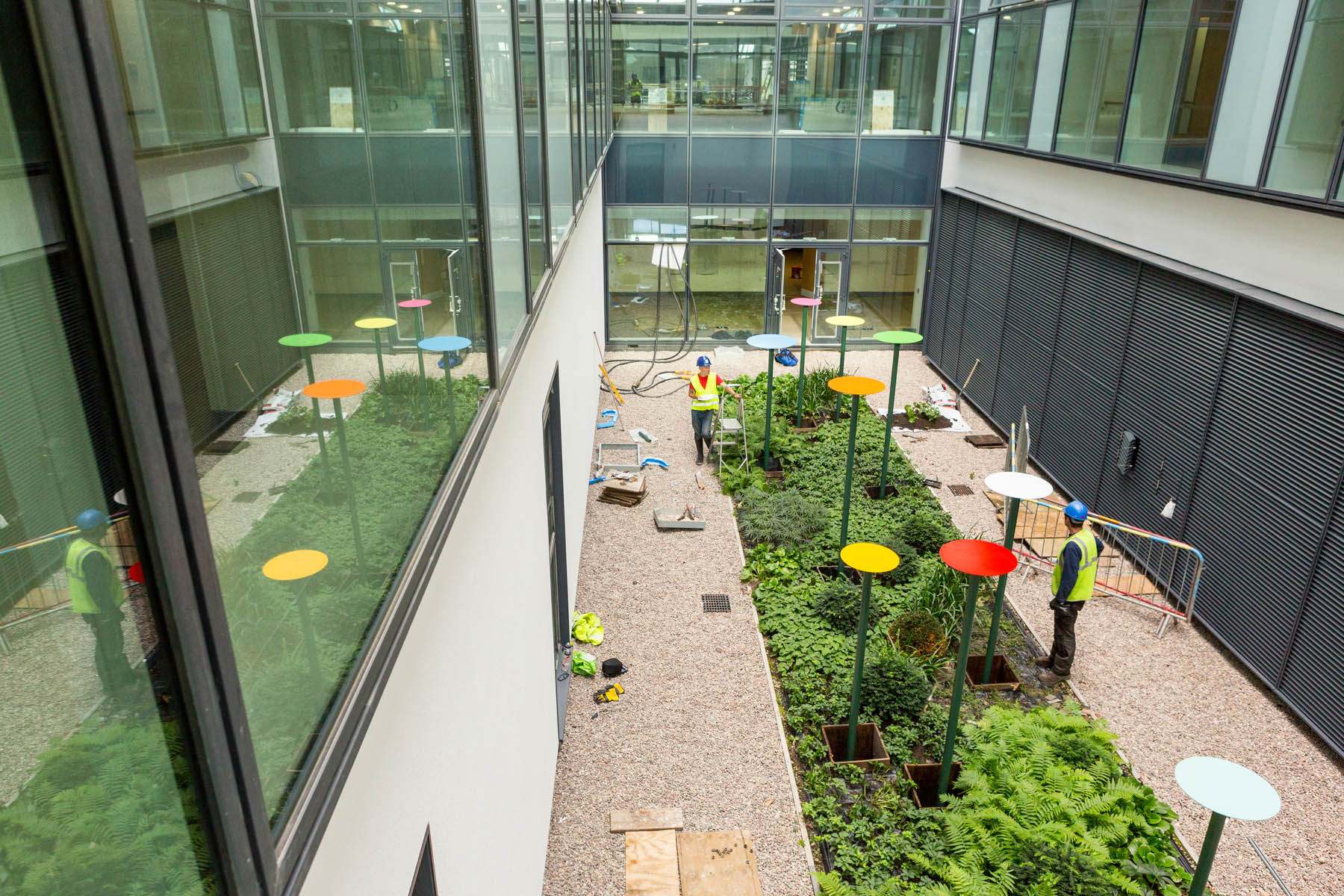 Ally Wallace’s sculpture comprises of nine coloured metal discs, mounted onto aluminium posts. The circular shapes contrast with the rectangular geometry of the building and organic area of planting and is designed to be viewed from a variety of areas within the surrounding buildings.