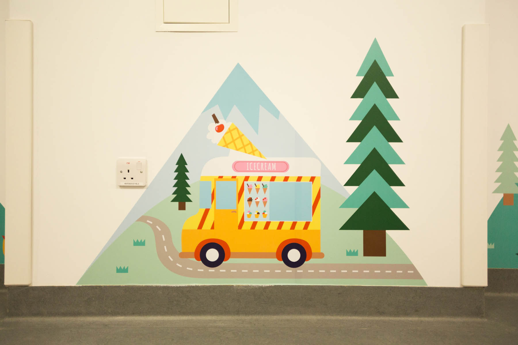 Emily used a warm cheerful palette of colours and a distinctive retro illustration style to create vibrant large scale artworks across the department.