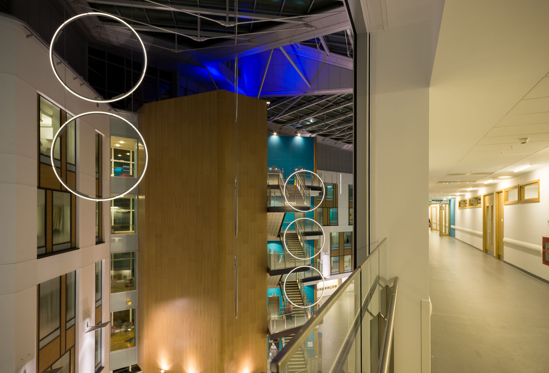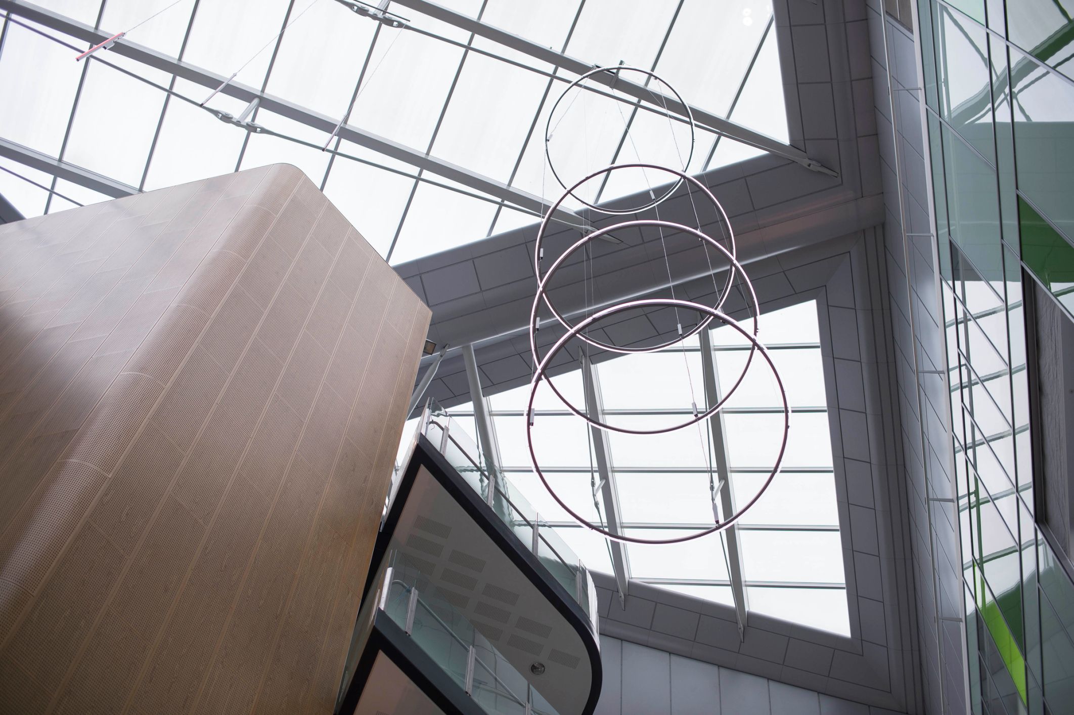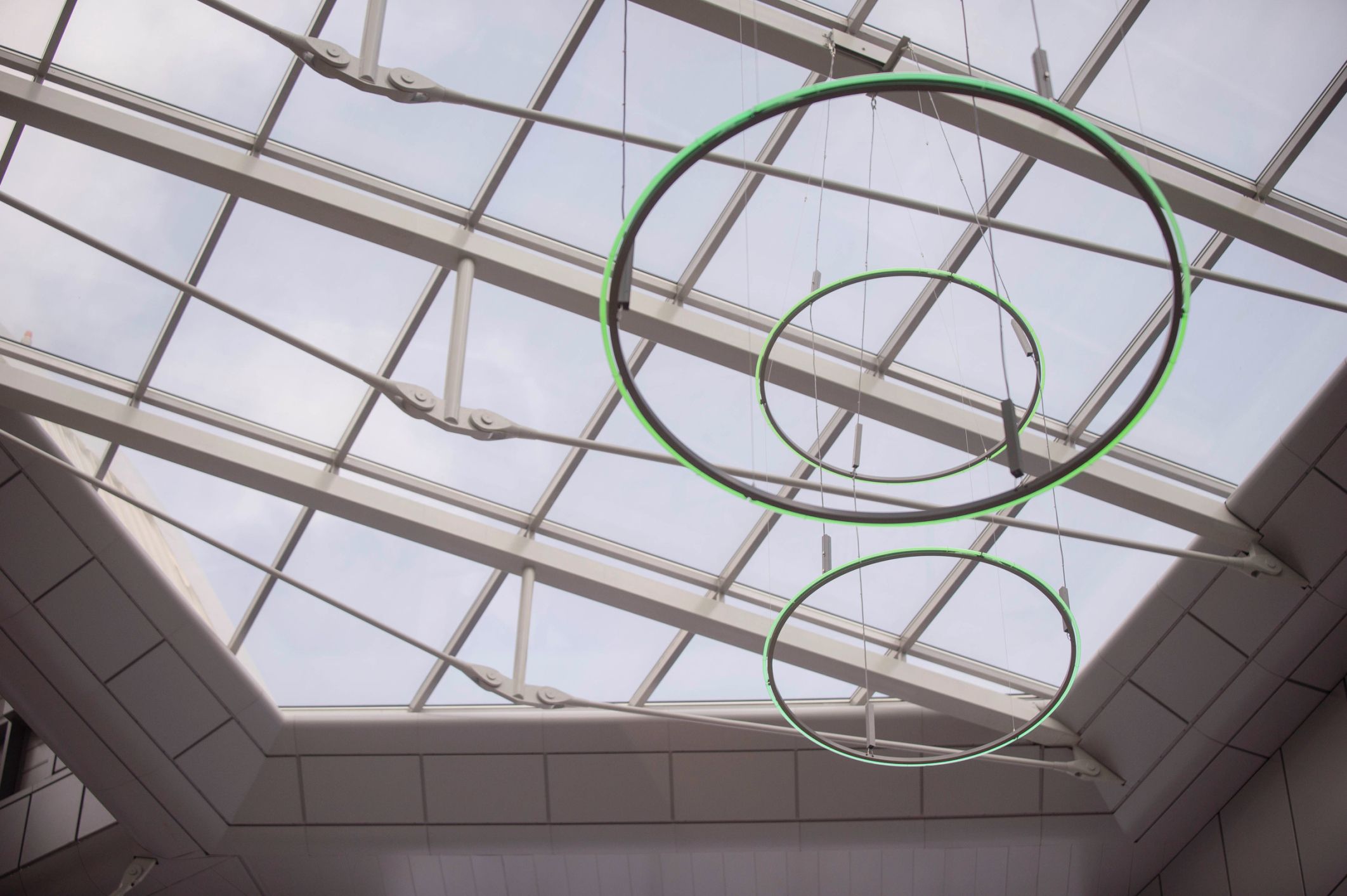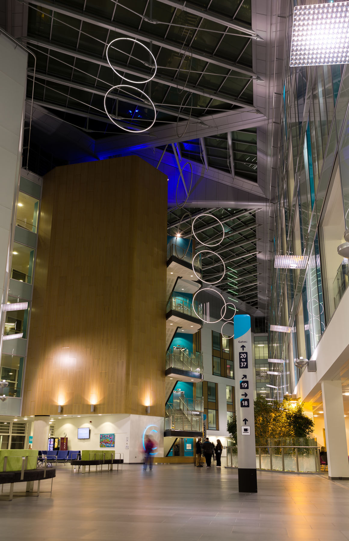 German artist Tobias Rehberger was commissioned by Willis Newson to create an artwork for the main concourse of the new Southmead Hospital Bristol. His work - which hangs from the roof of each of the three 7 storey atria - comprises of 3 neon light sculptures which combine to create binary clocks and provide a bold focal point and sense of arrival.