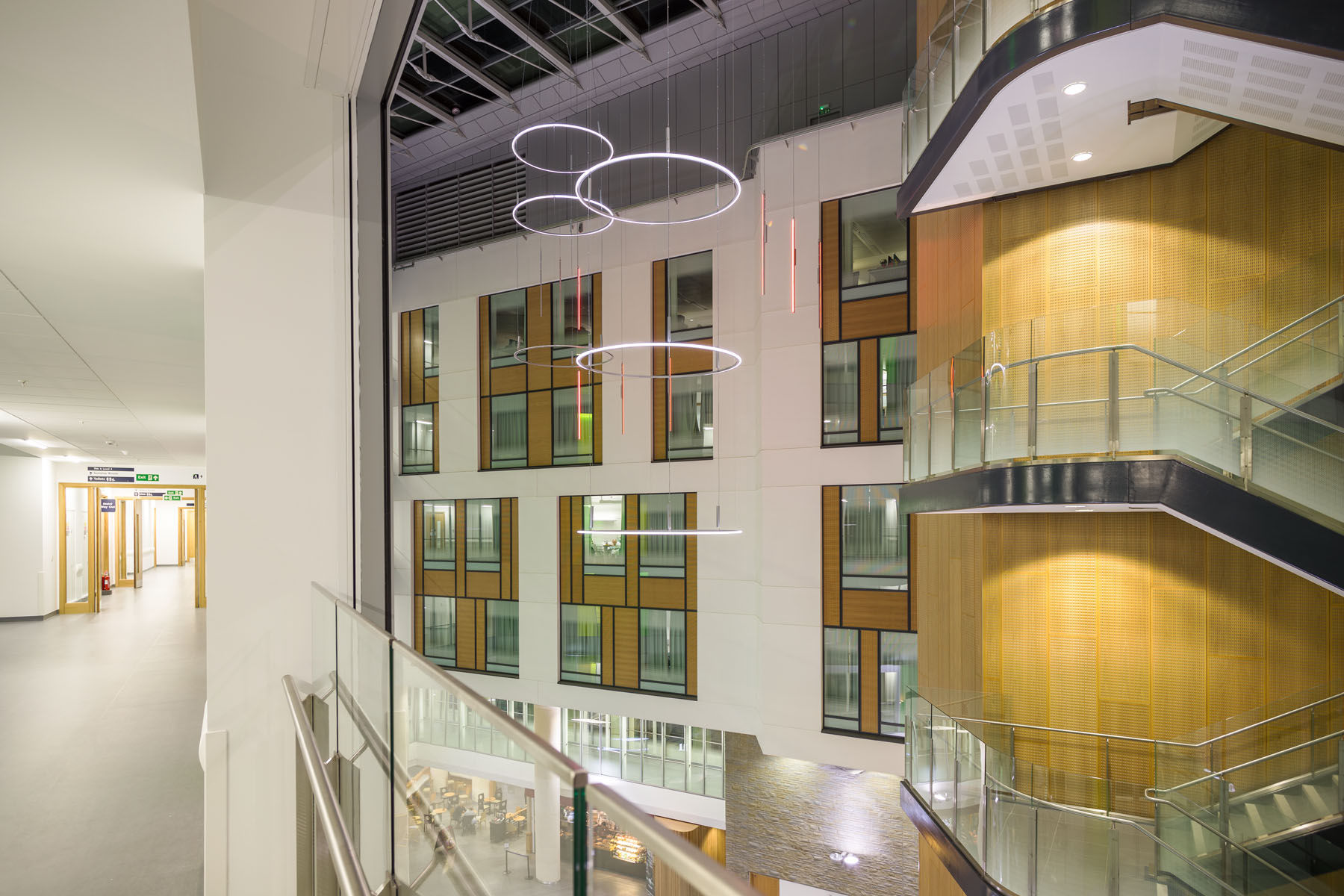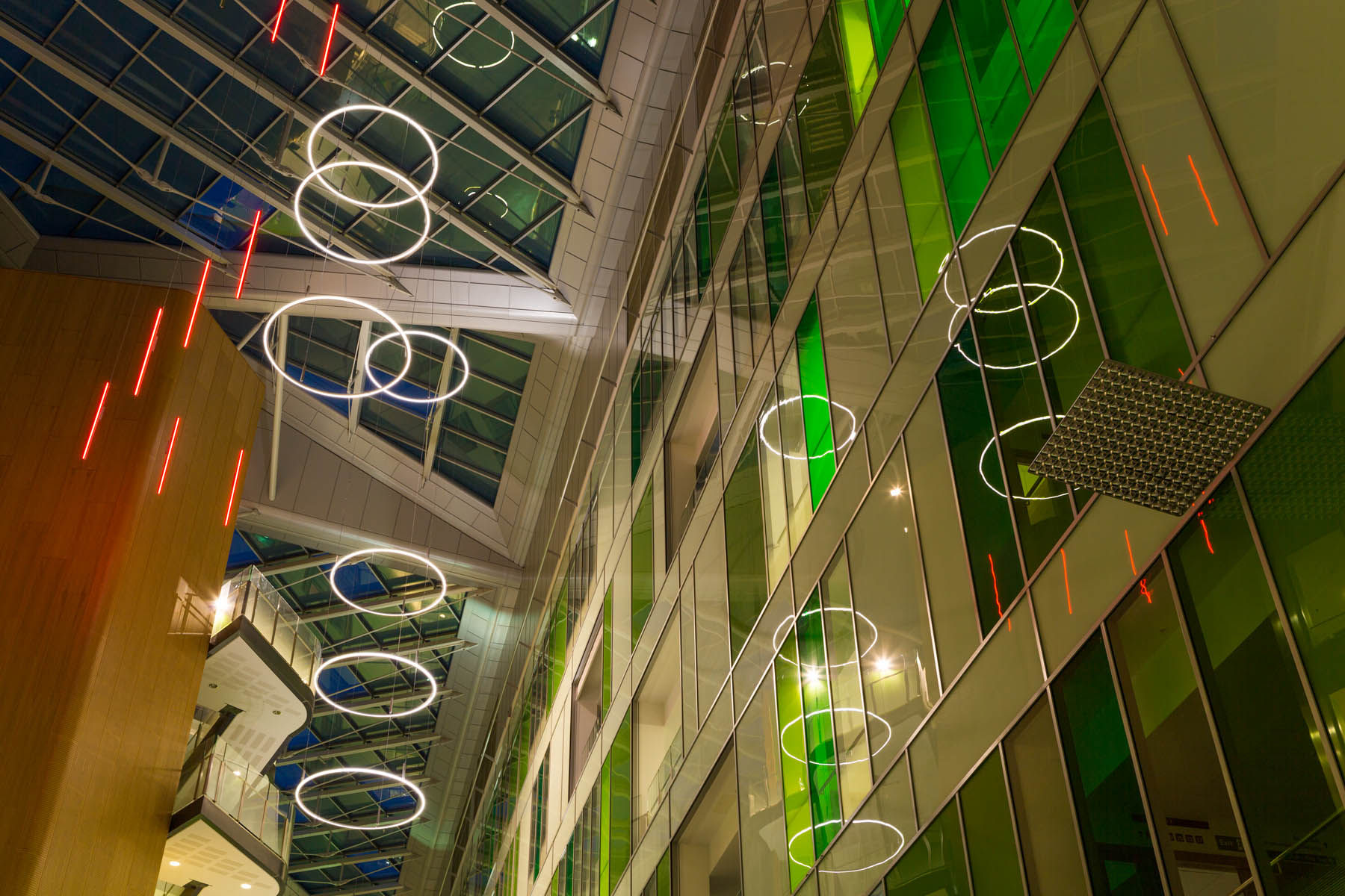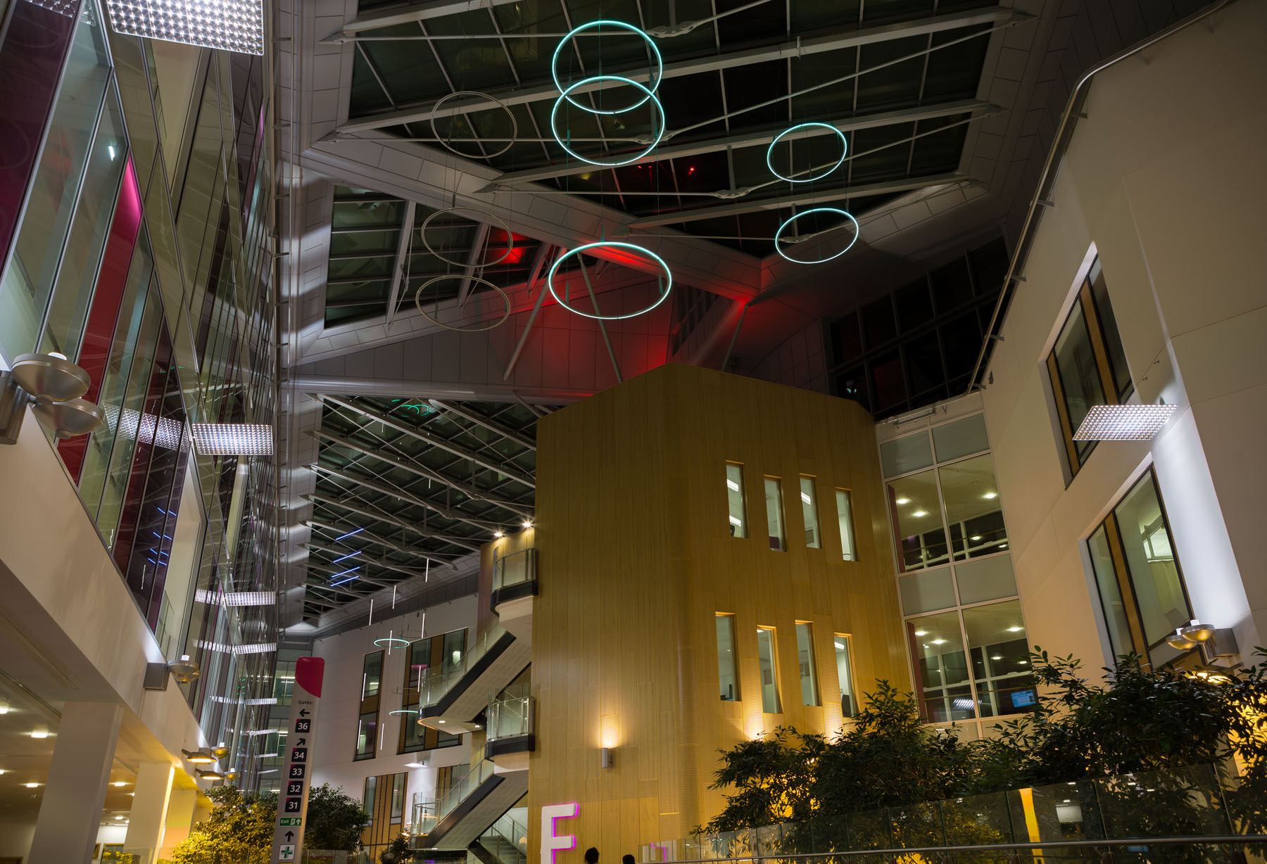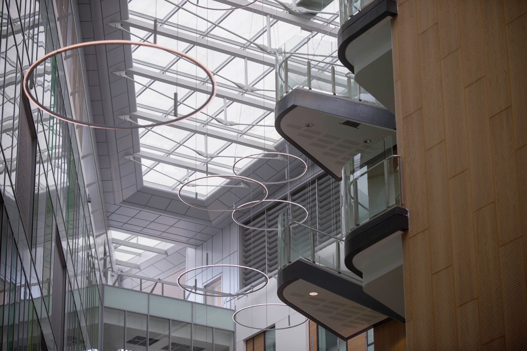 German artist Tobias Rehberger was commissioned by Willis Newson to create an artwork for the main concourse of the new Southmead Hospital Bristol. His work - which hangs from the roof of each of the three 7 storey atria - comprises of 3 neon light sculptures which combine to create binary clocks and provide a bold focal point and sense of arrival.