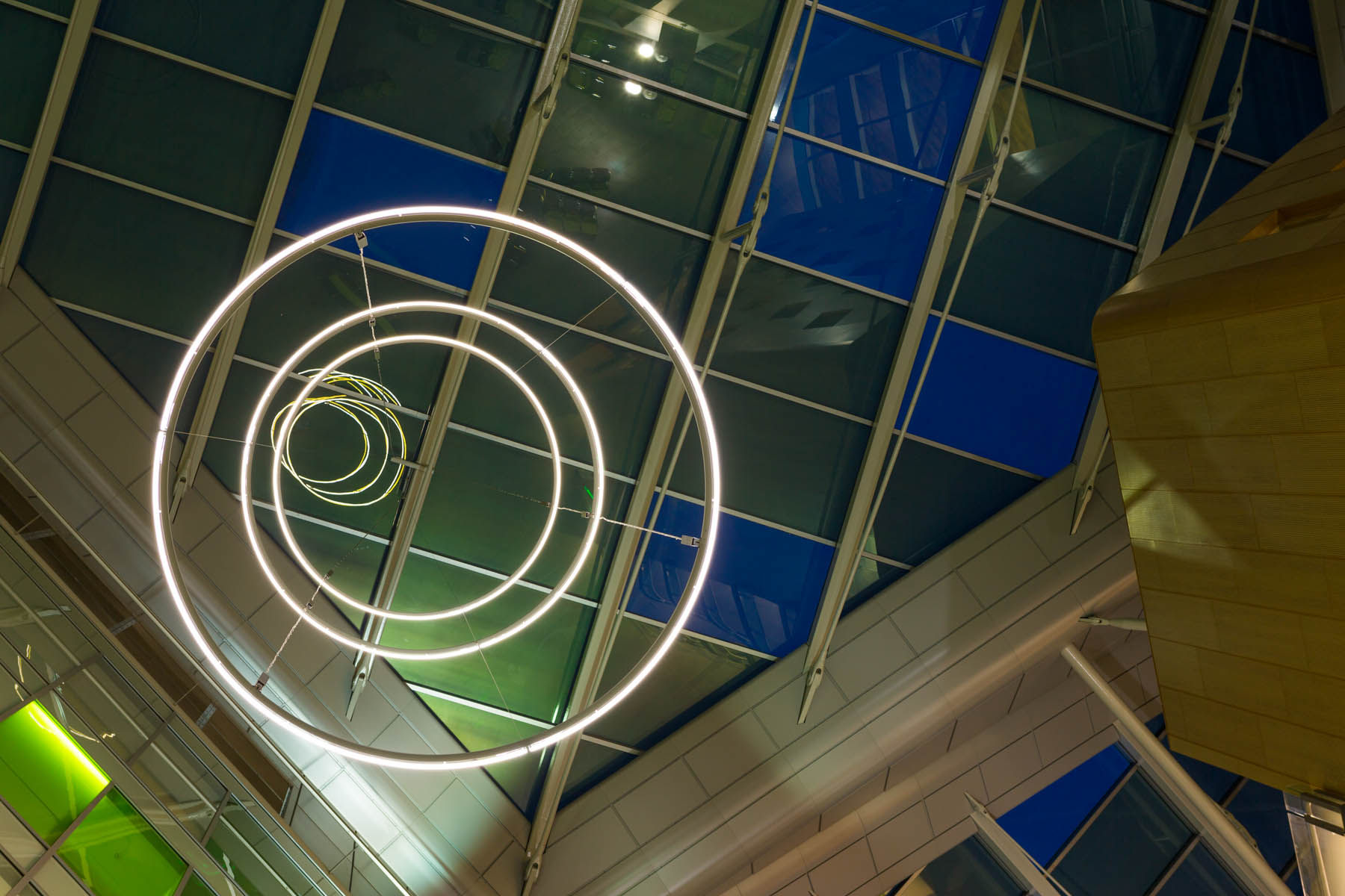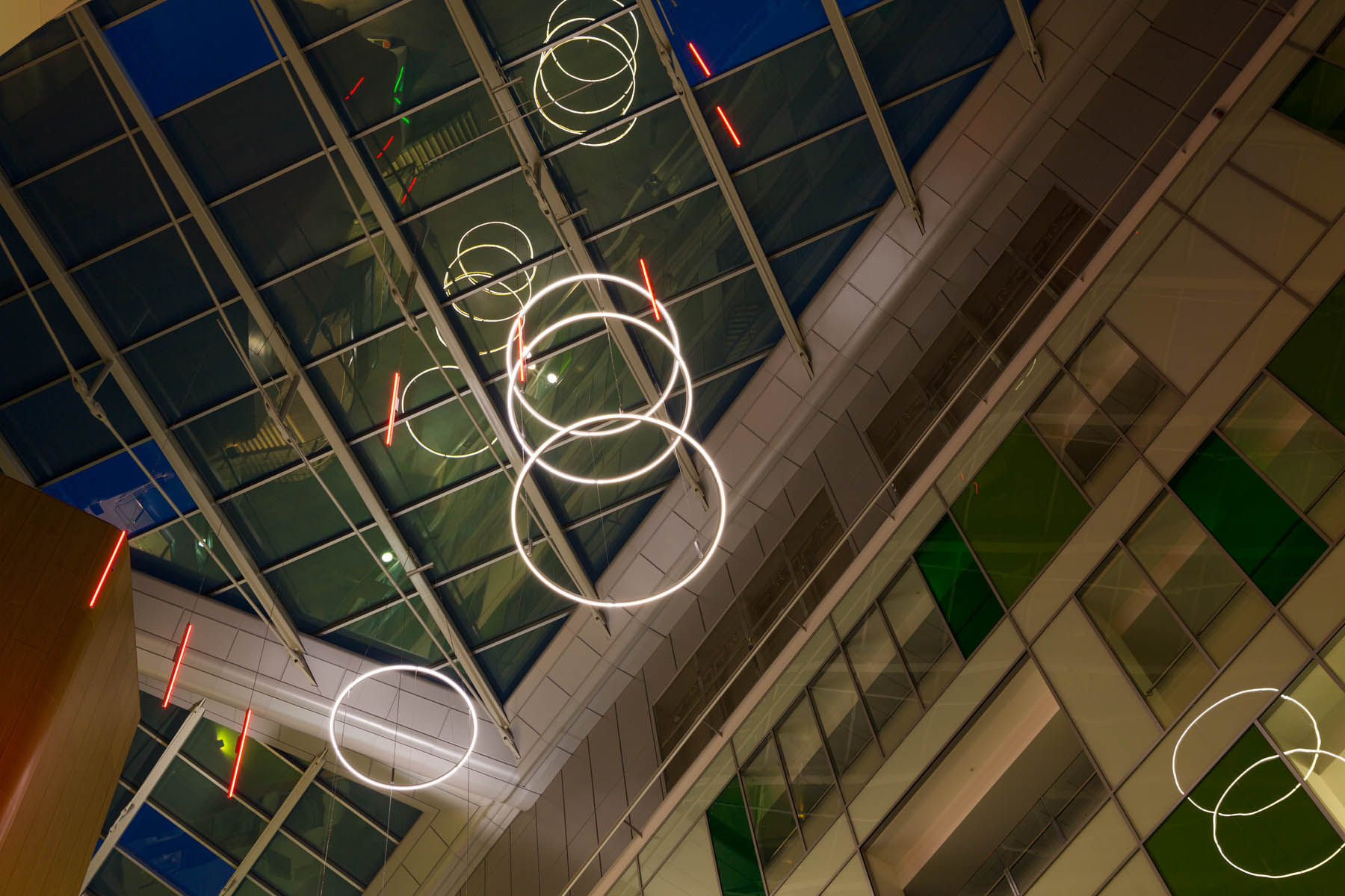 Tobias felt that ‘time’ was a particularly appropriate theme for the site. The sculpture consists of 78 suspended neon elements separated into three sculpture groupings. Each neon element is controlled by a computer and turns on and off according to the exact time of day.