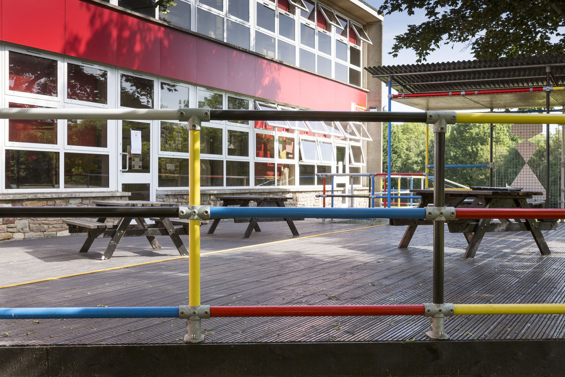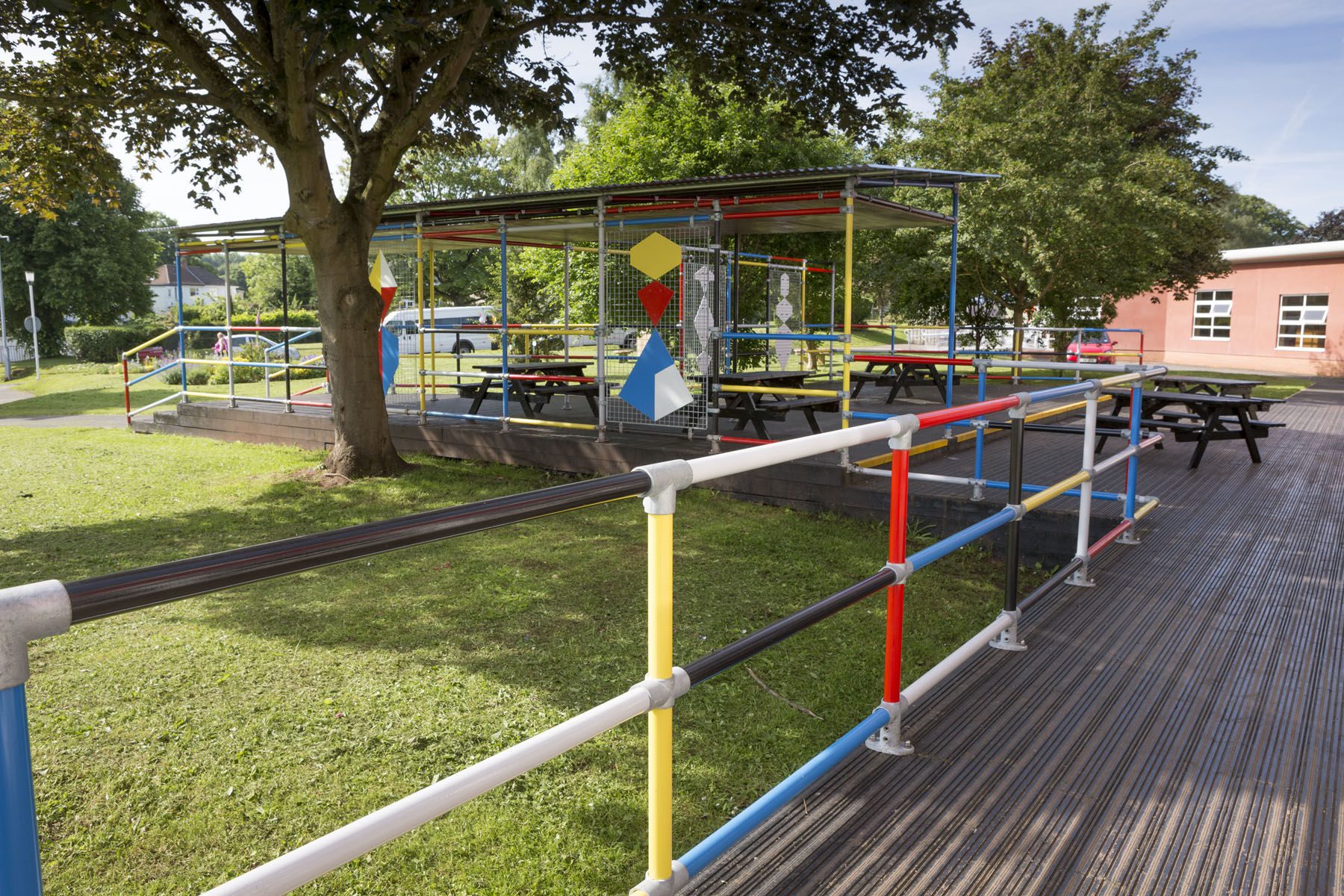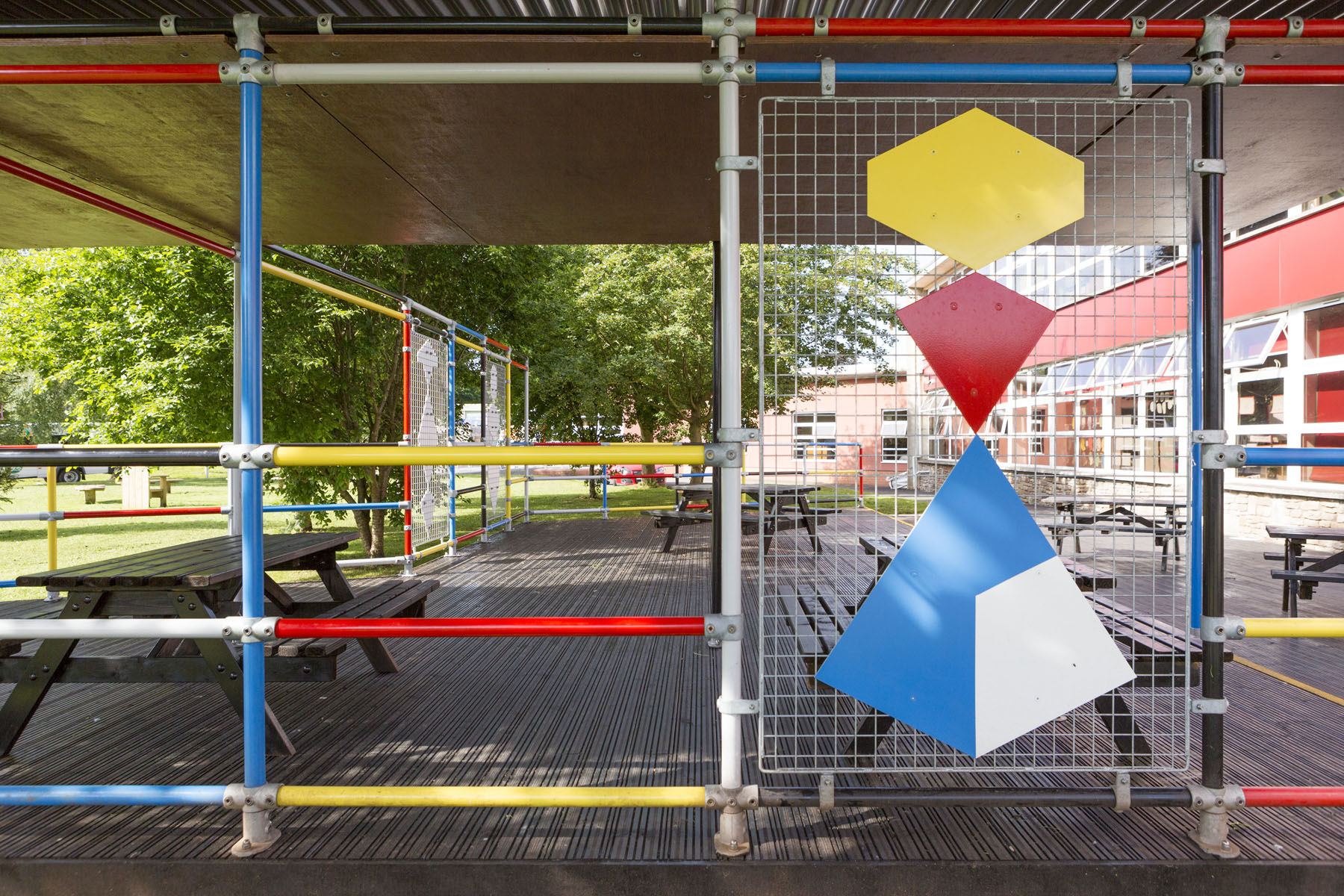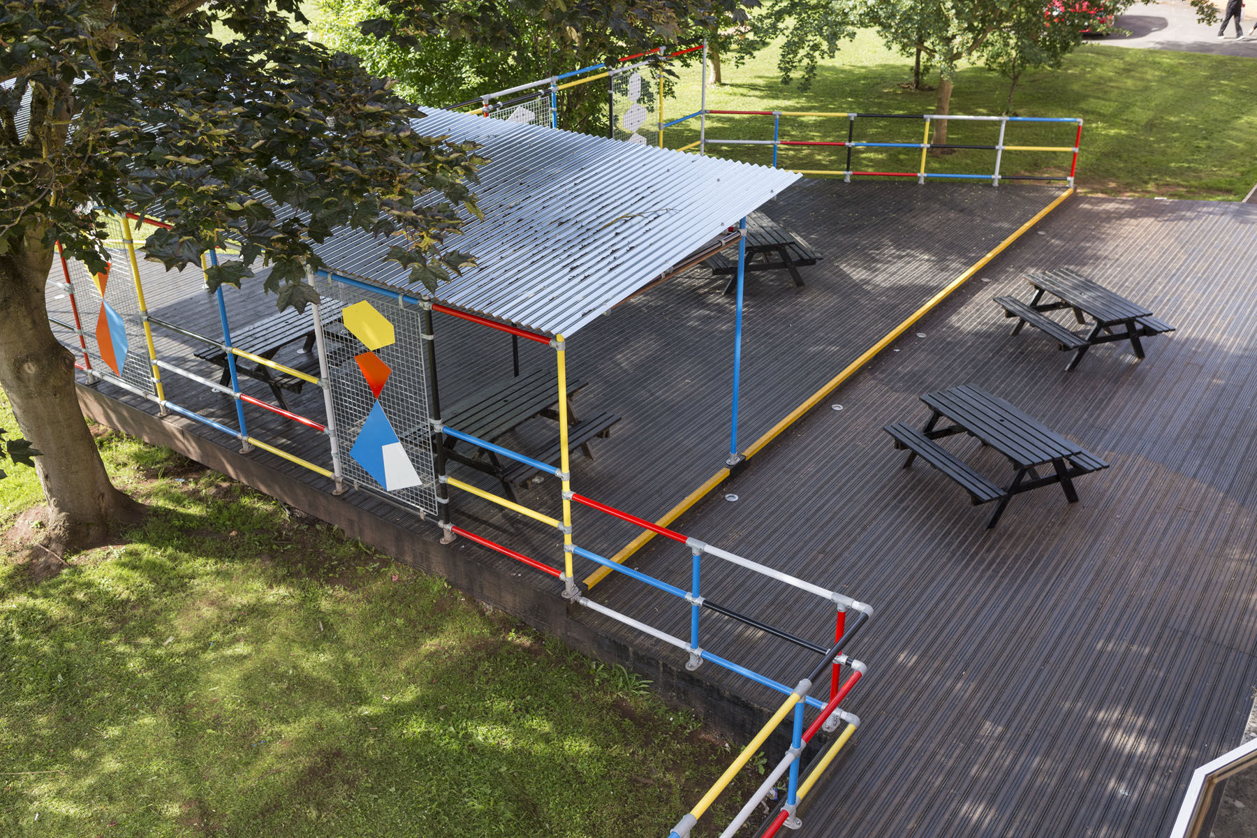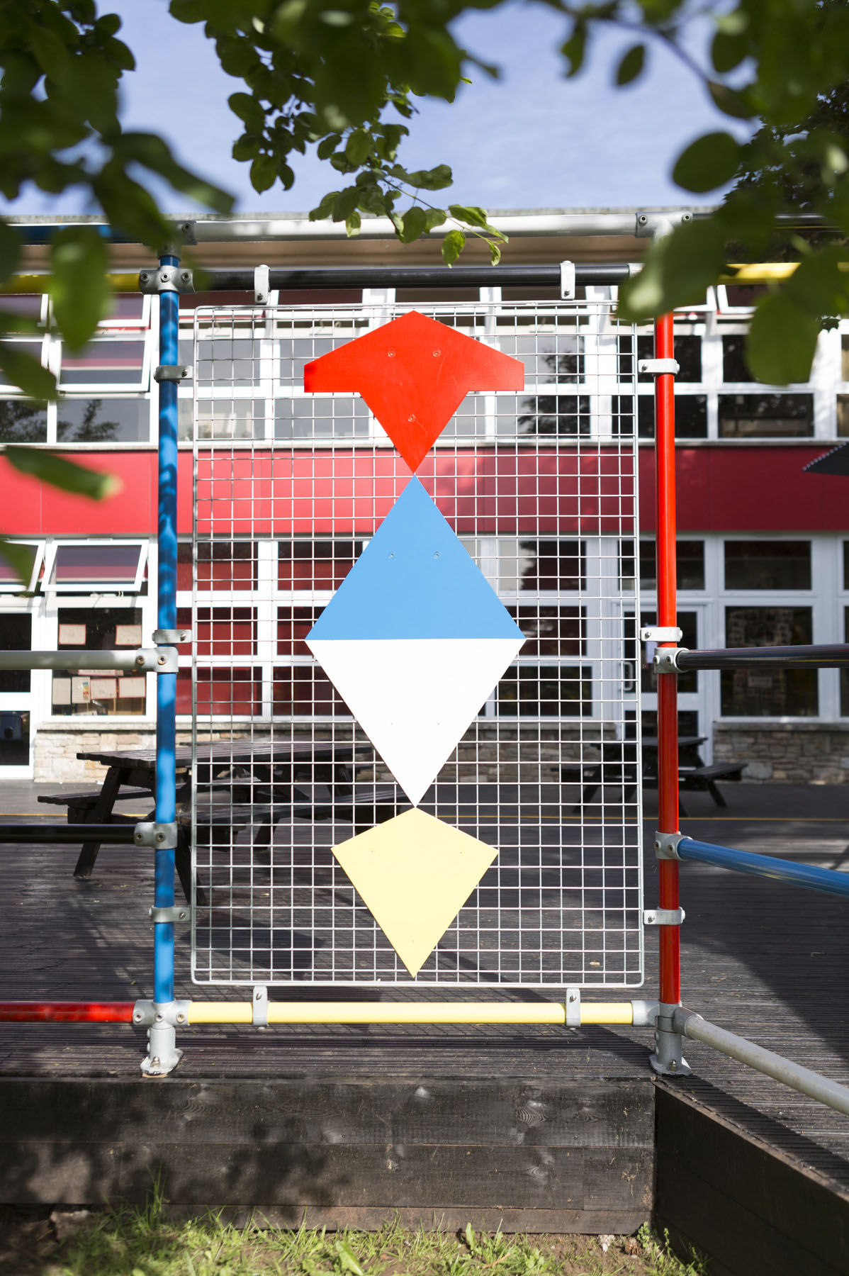 We wanted to use materials that were standardized and familiar and that are often used in a municipal environment, but to adjust their appearance to create something more dynamic. The form and colours of the pavilion draw influence from Modernist-era art and design via playground climbing frames. Primary coloured steel poles join together an area covered by a corrugated metal roof and a more open space, also linked by screens containing abstract shapes that make up the figures of puppet-like forms that look out form the school onto the world.
