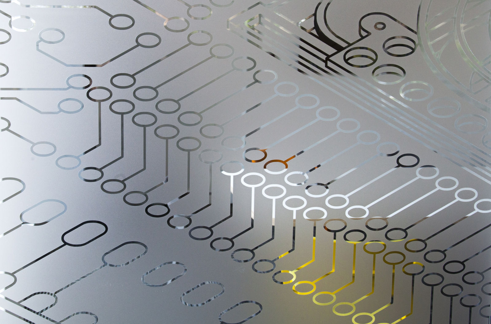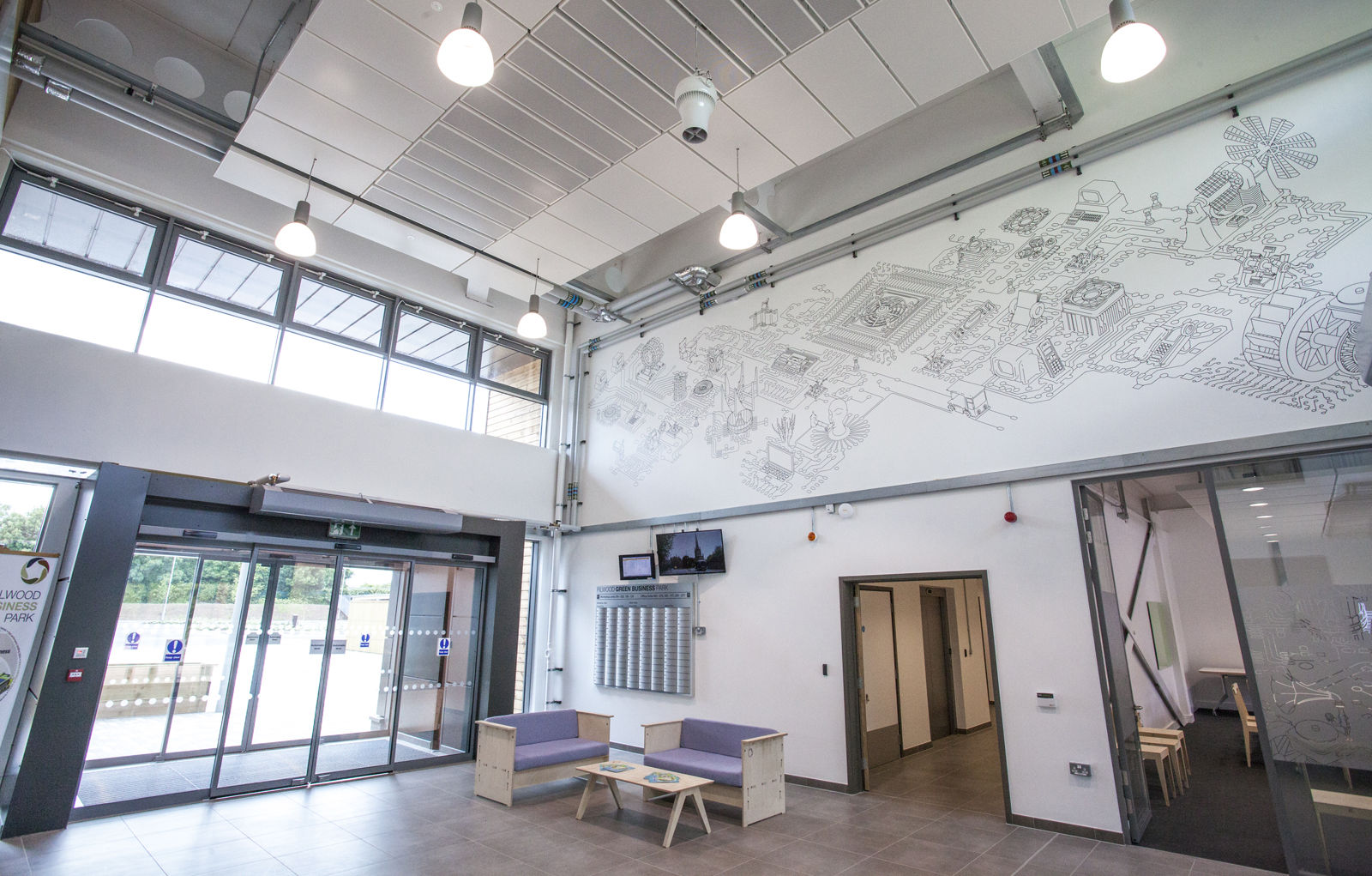 In addition to the making of furniture for the Business Park, artist Dane Watkins developed a series of manifestation graphics, which were applied to glazing in meeting rooms, and a large wall mural in the centre hub space. These works add interest to communal areas and link together the various spaces, as they reference green and digital technologies alongside more analogue modes of production in their underlying thematic.