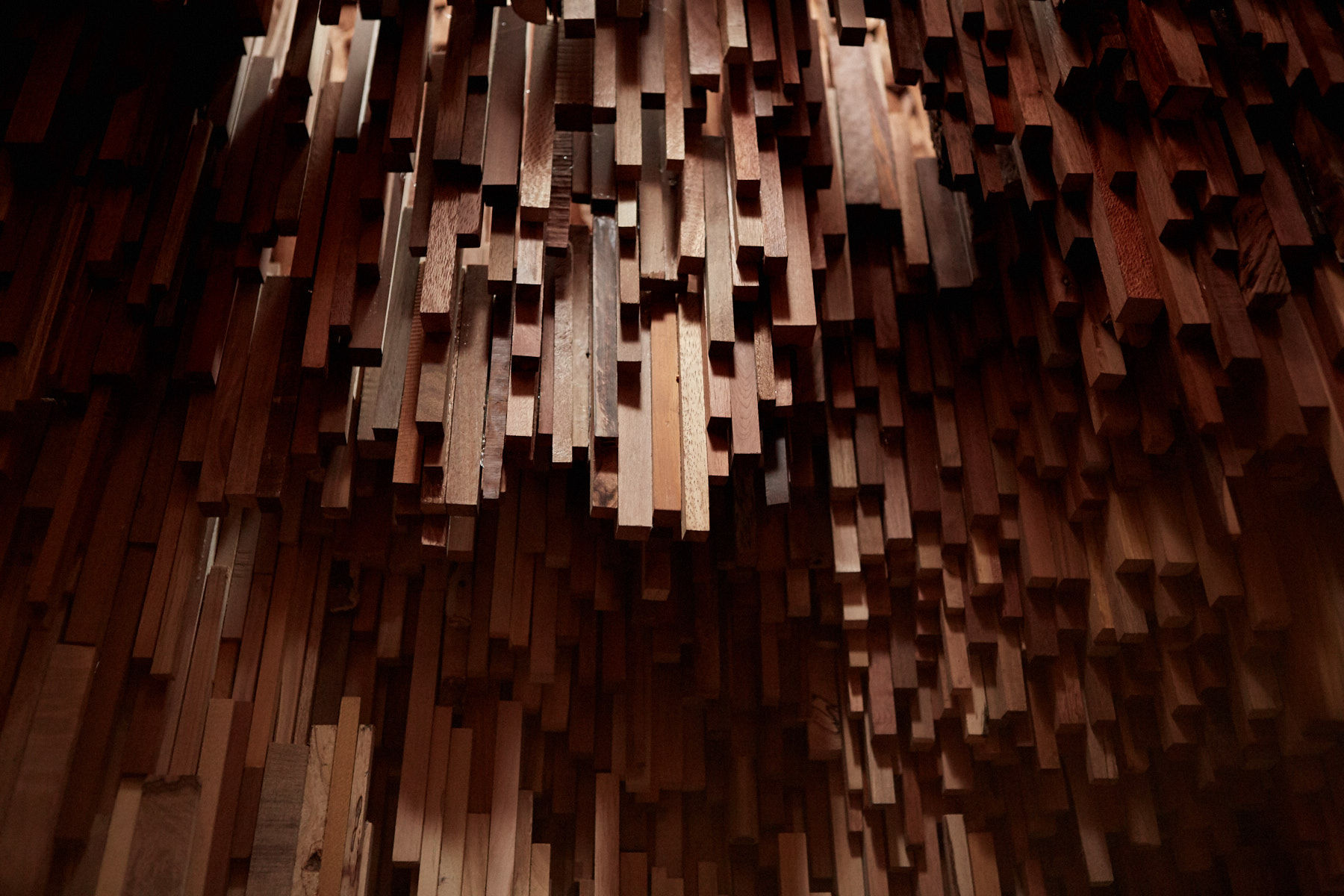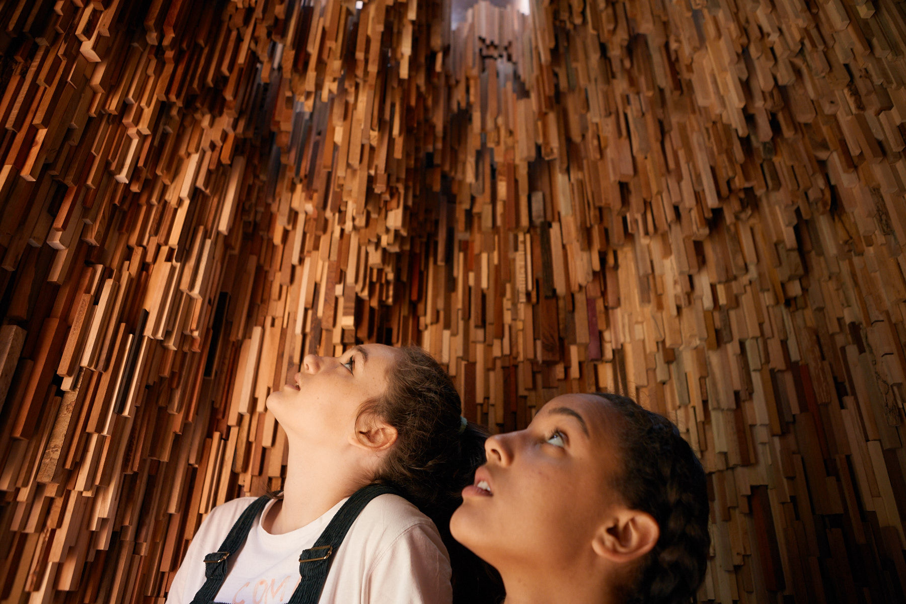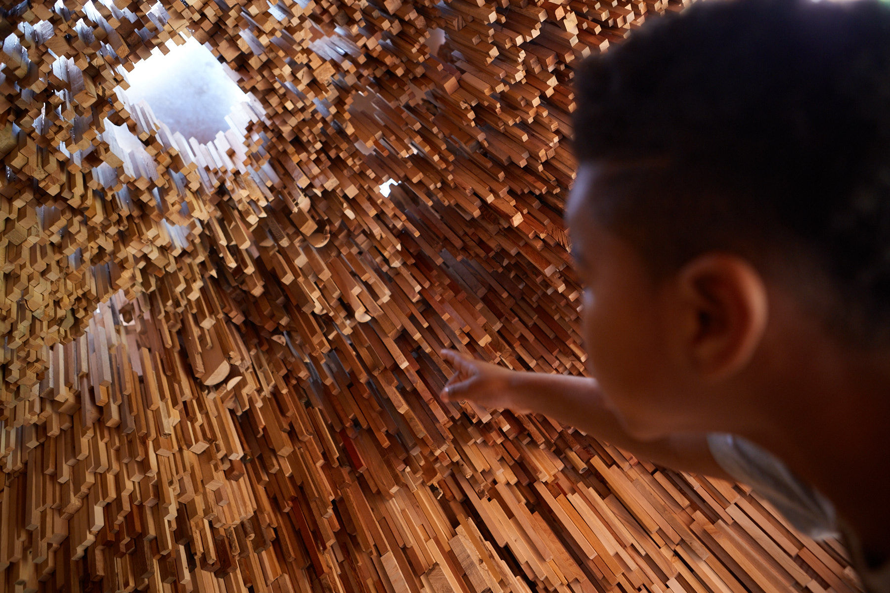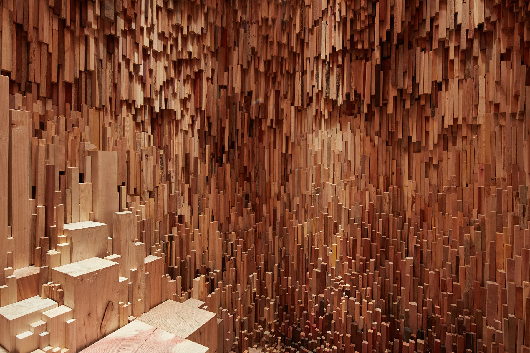 Spanning millions of years, Hollow is a miniature forest of all the world’s forests, telling the history of the planet through the immensity of tree specimens in microcosm. The exterior cluster structure reflects a forest canopy’s ecosystem, the forms of the Douglas Fir posts reflecting the varying heights of trees. The interior of Hollow tells the history of the planet through over 10,000 unique tree species, from petrified wood fossils of the earliest forests that emerged 390 million years ago to the most recent emergent species.