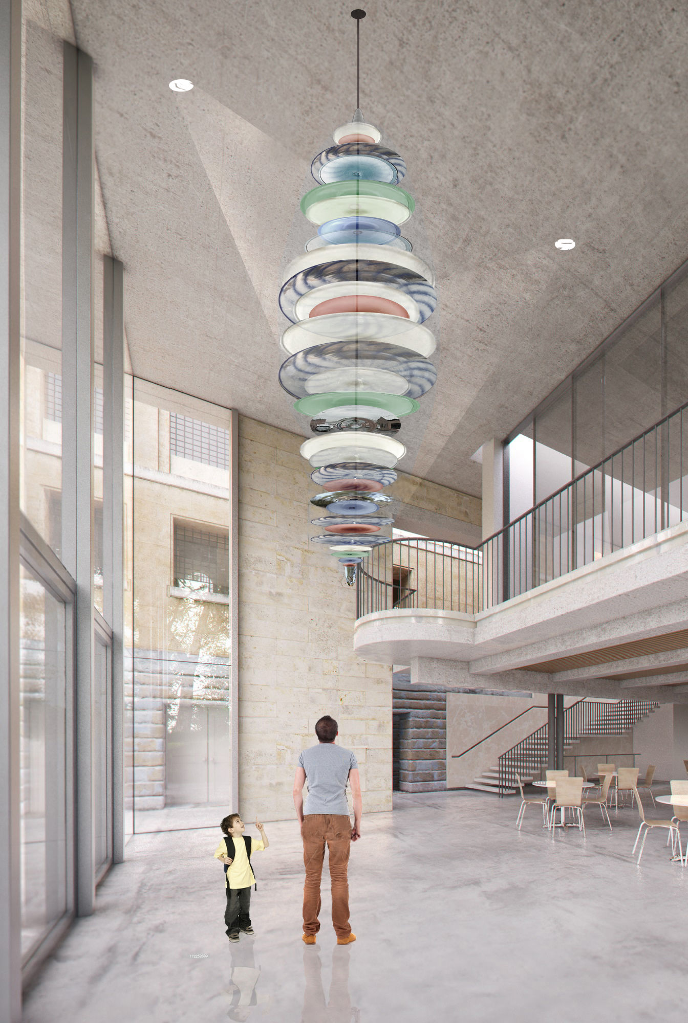 The form of the artwork is made by taking a sound file from a section of famous Philip Glass music Philip Glass’ Etude No 2 and rotating it about its axis. The music is especially fitting as Philip performed it at his first visit to St George’s in 2013. The sound-wave sculpture, entitled Apollo (for the Greek God of music), will consist of approximately 100 hand-blown coloured glass roundels fused together.