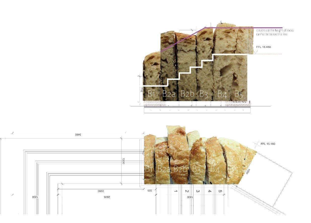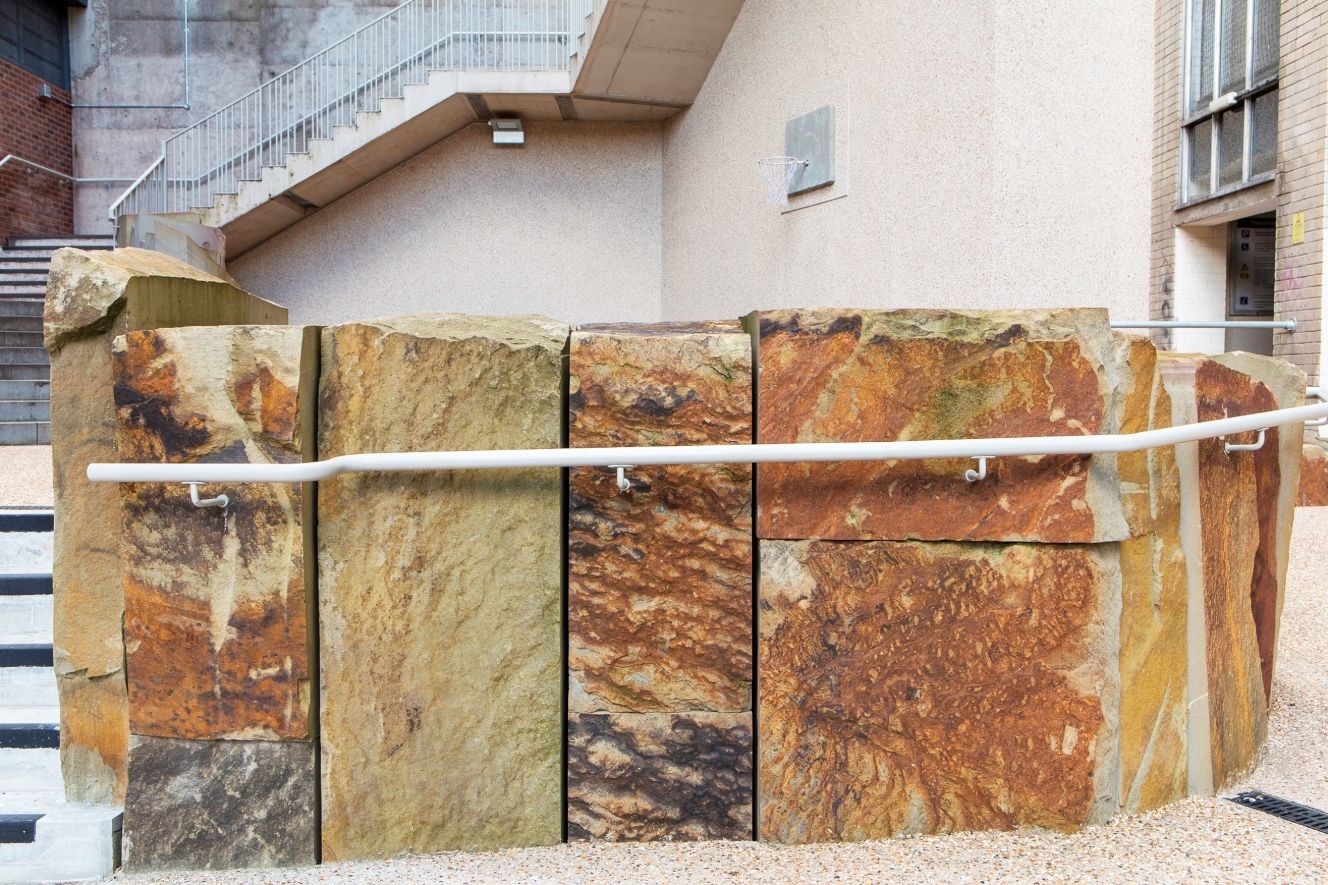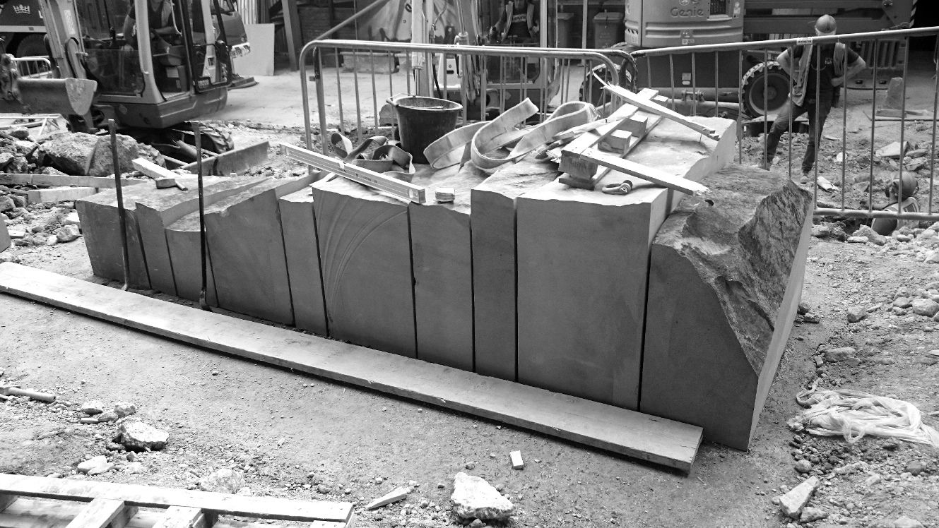 A decision was made to procure locally and the stone was sourced from Barnhill Quarry in the Forest of Dean, Gloucestershire; the closest Pennant sandstone quarry to the site. The detail design was advanced through visits to the quarry to identify the most cost effective and technically viable way to maximize the drama of using very large stone blocks with the oxidised red outer crust contrasting with the blue/grey cut faces.
