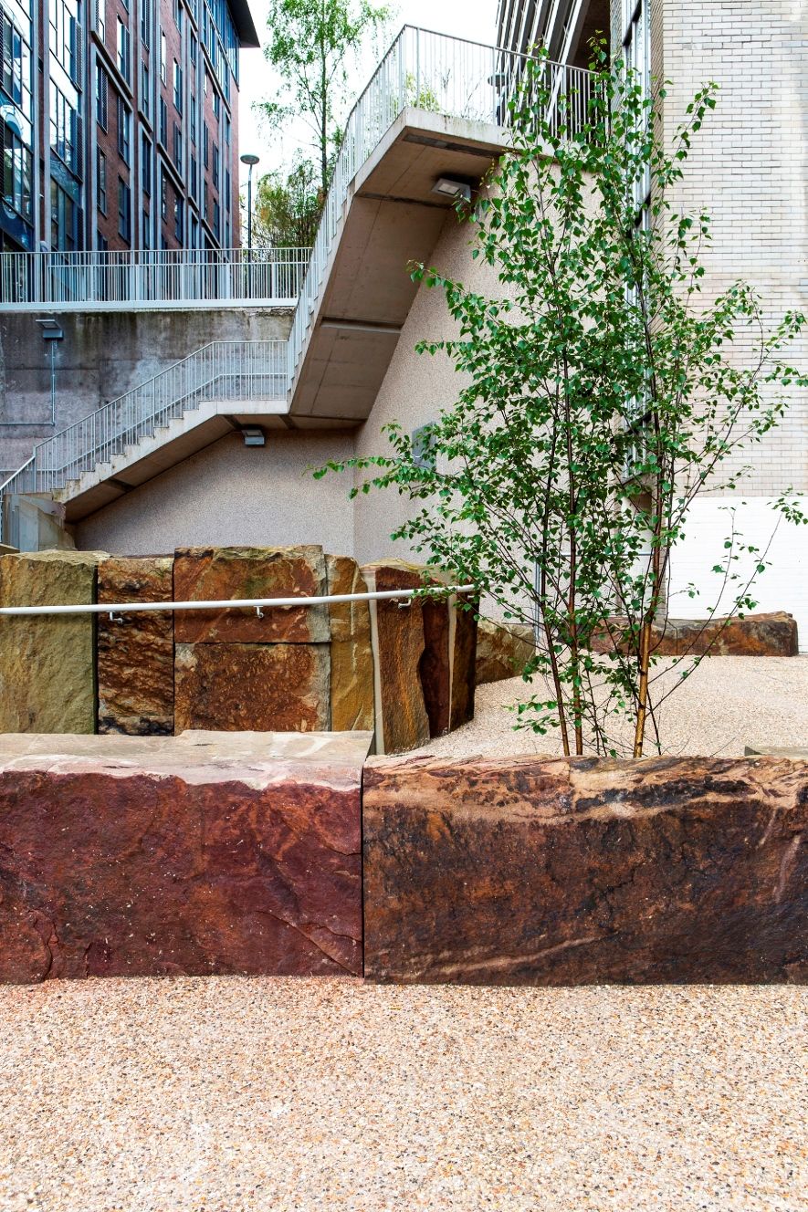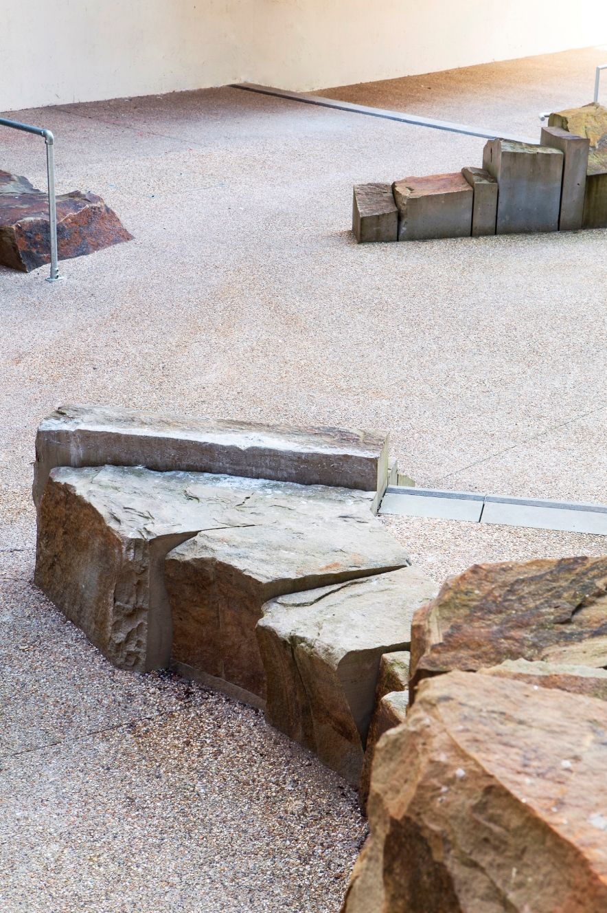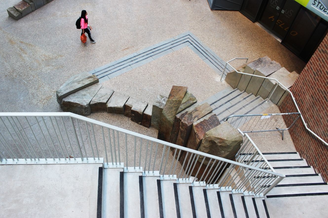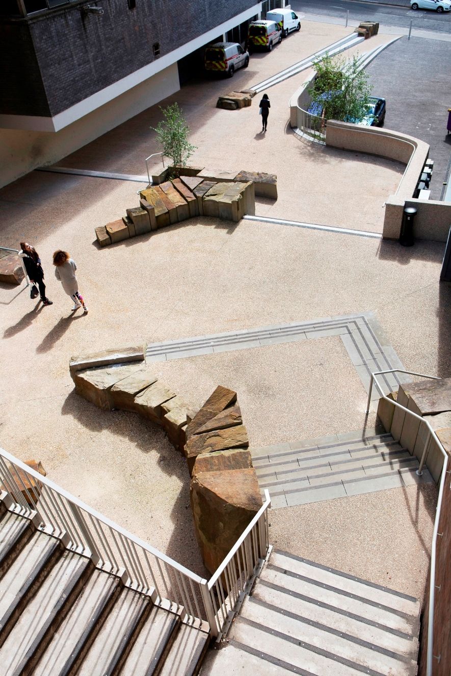 Natural stone is used to create a landscape of informal seating and to take up the level differences where steps and ramps meet and to ground the main flight of steps from the upper level.