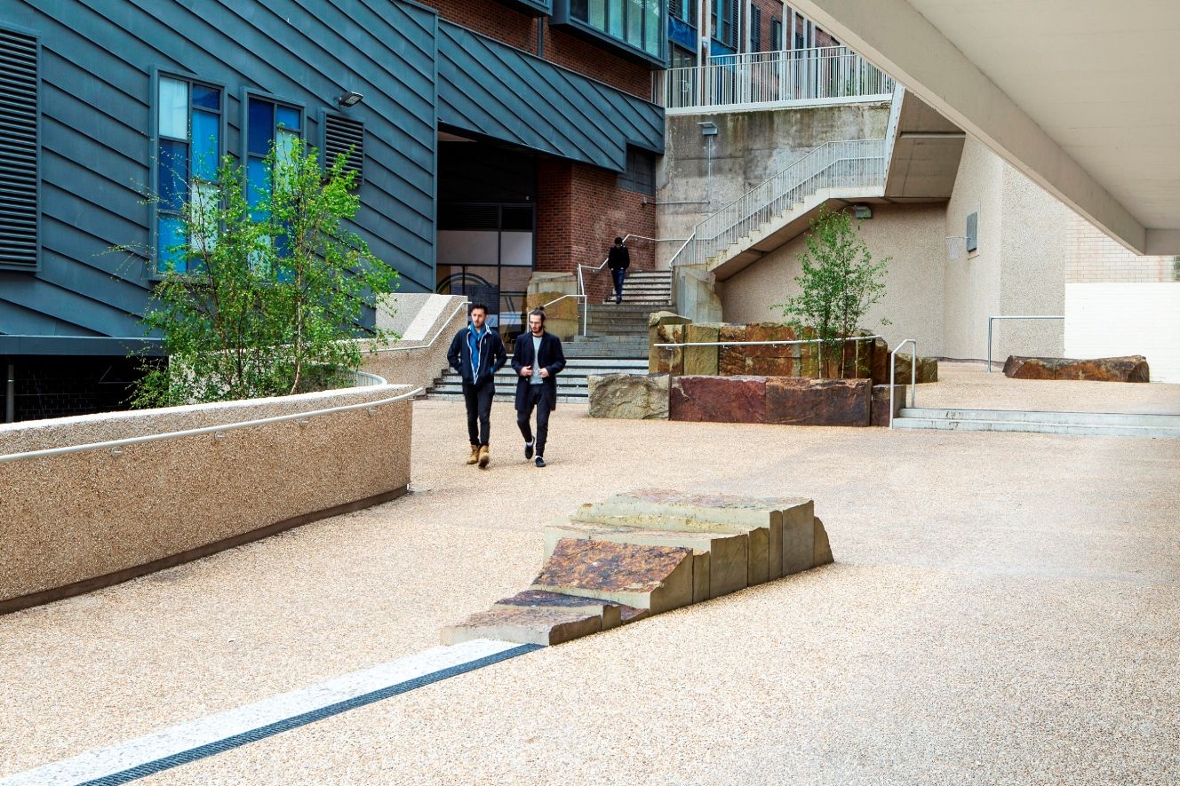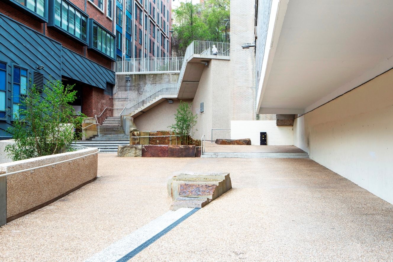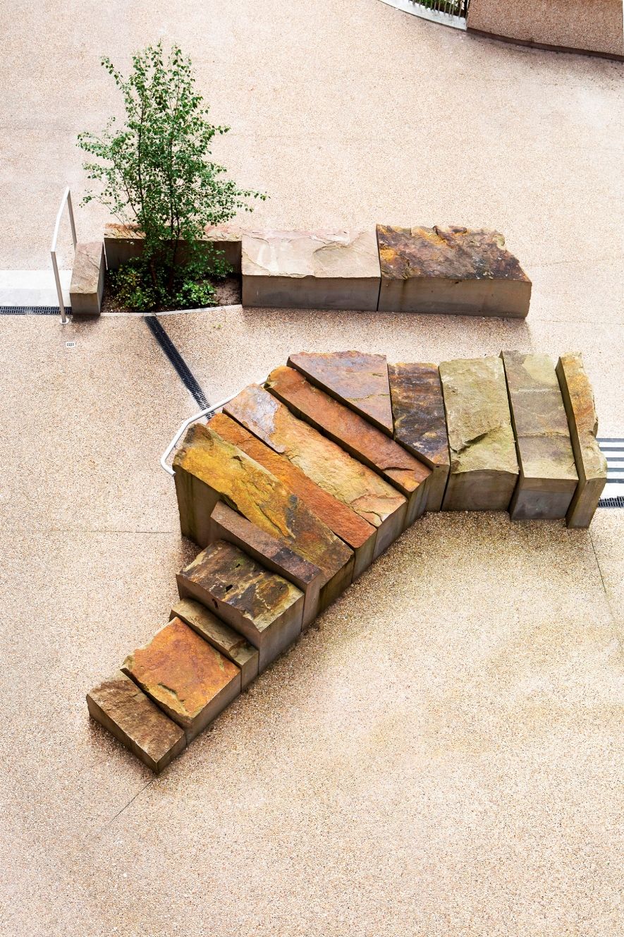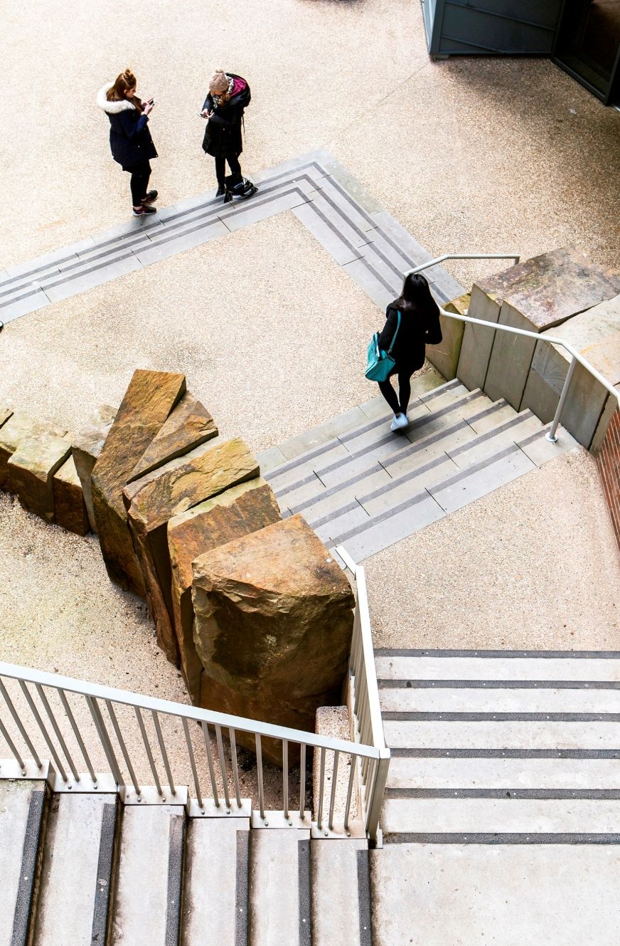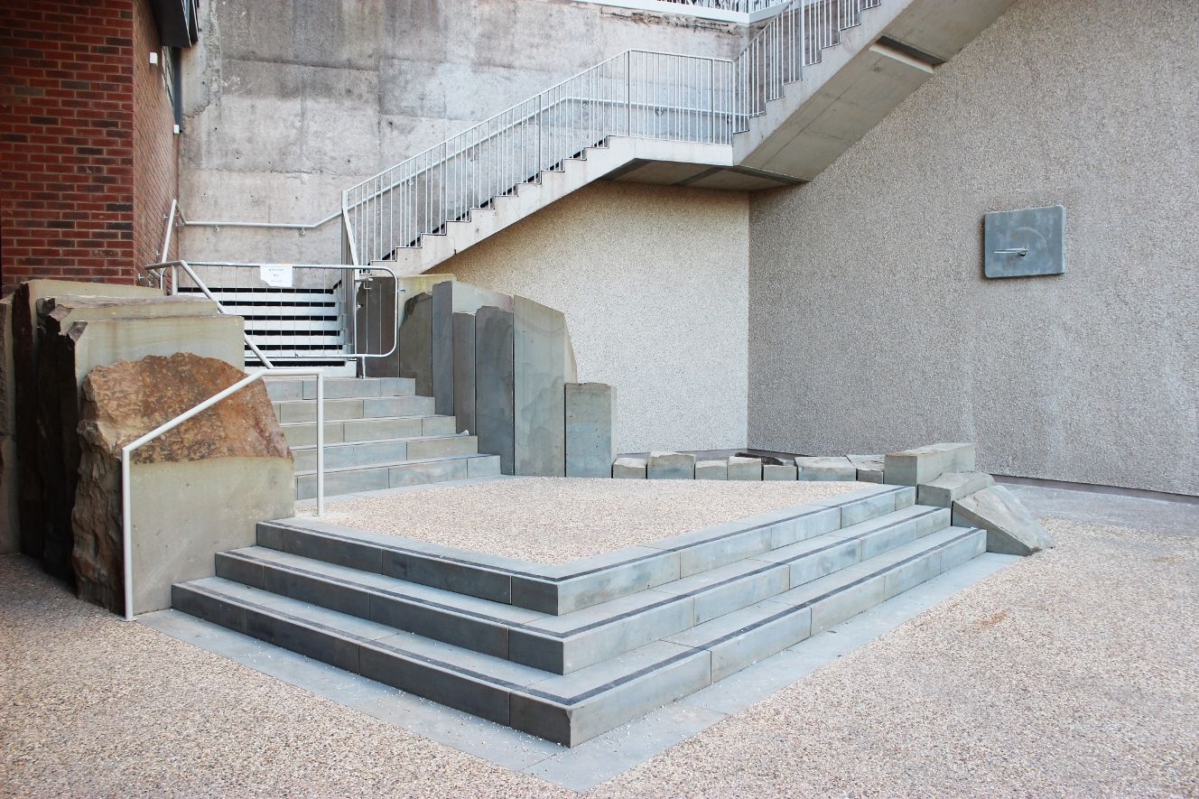 Natural stone is used to create a landscape of informal seating and to take up the level differences where steps and ramps meet and to ground the main flight of steps from the upper level.