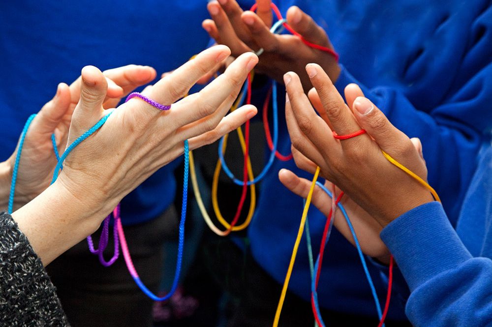 Plender’s commission for Easton CE Academy draws inspiration from string games or string figures, the most common of which in the UK is ‘cats cradle’. String games are played by weaving a single loop of string on the hands in order to produce intricate patterns. The patterns are named after familiar objects that they resemble such as the cradle, railway tracks, a hat etc. String games appear in most cultures around the world as an activity for both adults and children. In the past they were often played by sailors, who learnt them on their travels and passed them between different countries. Thus the string games link to Bristol’s maritime history as well as the diverse cultures present within Easton CE Academy.
