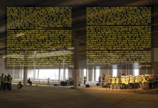 The Cabot Circus Cantata, was intended as a celebration of the onsite diversity. The publication is accompanied by a DVD of the songs as they were recorded on the building site.