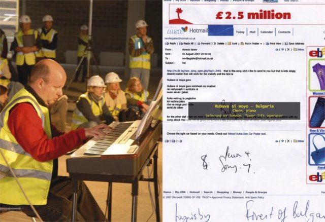 Over one week in spring 2007 Neville Gabie and David Ogden spent time onsite asking site and office staff to sing a song from their home country. Contributions varied hugely in content and style, but over the course of that week more than twenty-five contributions covering several nationalities were made. Those songs formed the basis of a musical score developed by David Ogden. Many of the songs were then learnt in the different languages to be performed by the City of Bristol Choir on the building Site in the empty shell of what will be the new House of Fraser store and to an audience in St James Priory.